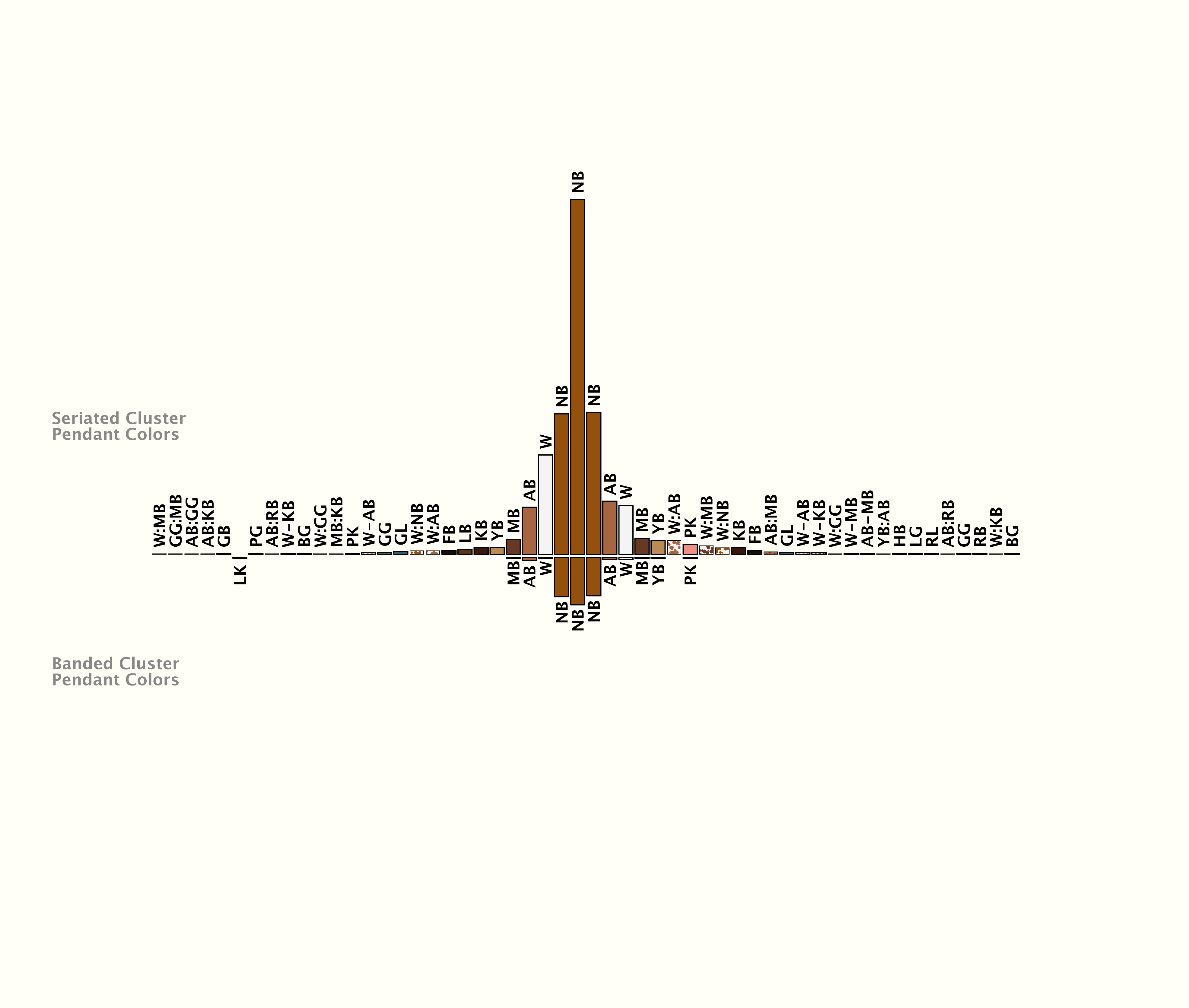 I decided to define a color-banded group by looking at contiguous pendant colors, regardless of cord group boundaries. What about cords that have multiple ascher colors per cord (i.e. they are segmented cords)? This wrinkle made writing the code a nightmare. I had two apparent solutions. I could define these segmented cords as one concatenated color (ie. a super color), or I could define them by the color of the longest segment. I chose the later for this study. Is this a good and appropriate simplification? It turns out ~3.5% of the pendant cords are segmented colors with a distribution of 1122 out of 32395 cords (3.46%) with (num_color_segments, num_cords) = [(2, 863), (3, 207), (4, 50), (5, 2)]. So, the result is a list of pendant cords independent of cord group limits, arranged by distance along the primary cord, assuming segmented cords use their longest color.
