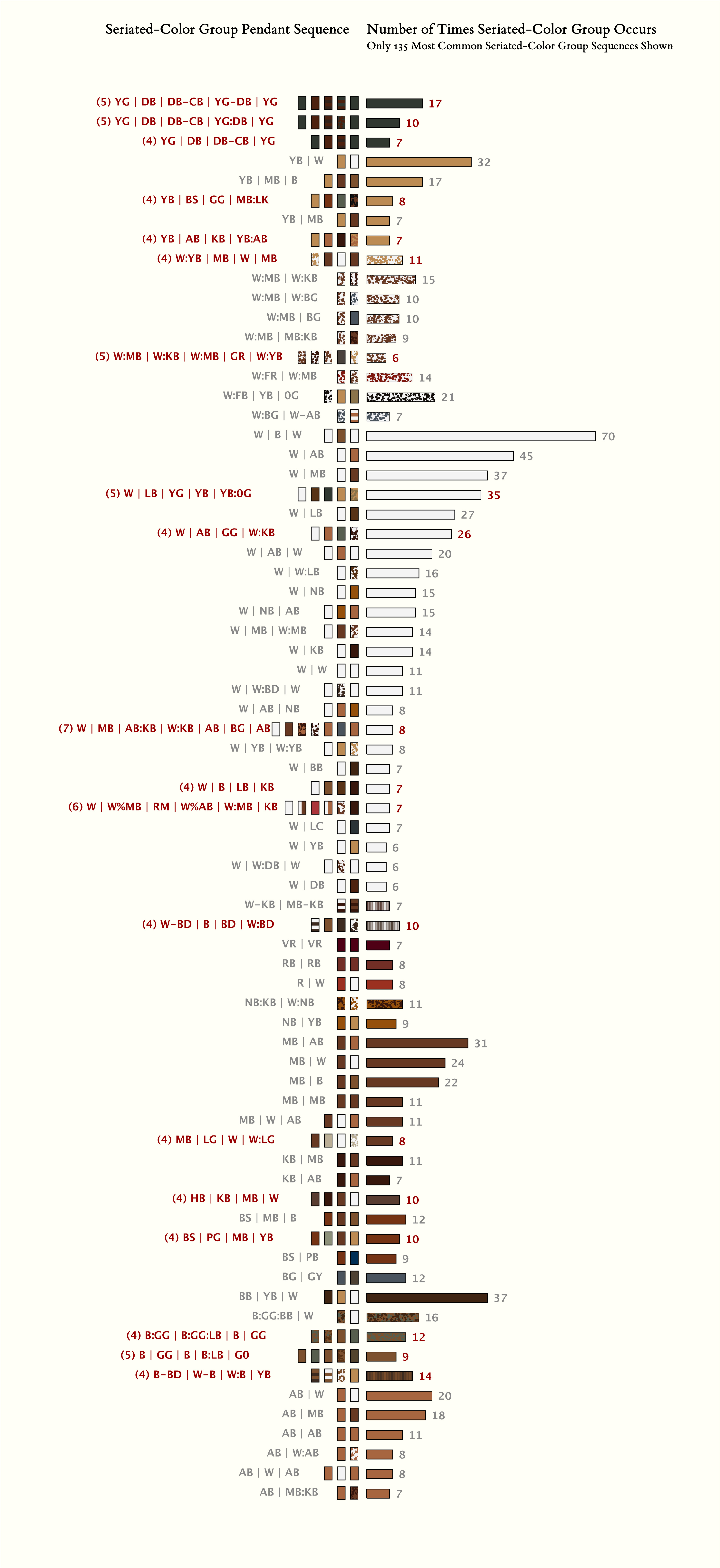 You can see that White cords occur A LOT. 4 of the top 5, are White cord groups of (num_cords, count) [1:632, 6:149, 7:137, 3:109, etc…]. At the bottom of the distribution, there are a lot of sequences that only occur twice: