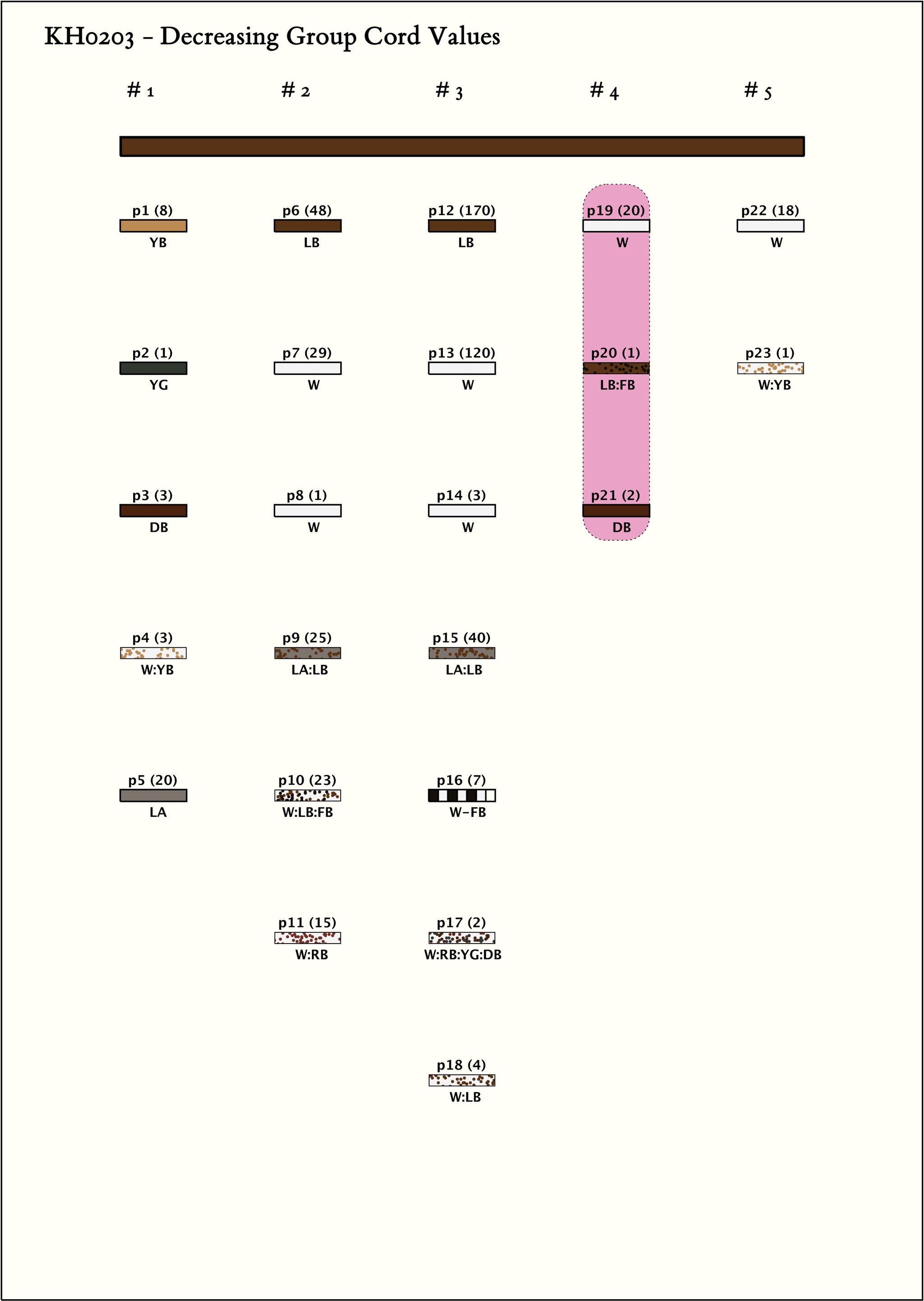 - By spacing, the khipu is separated into 5 groups. Only the first and last group have subsidiaries.