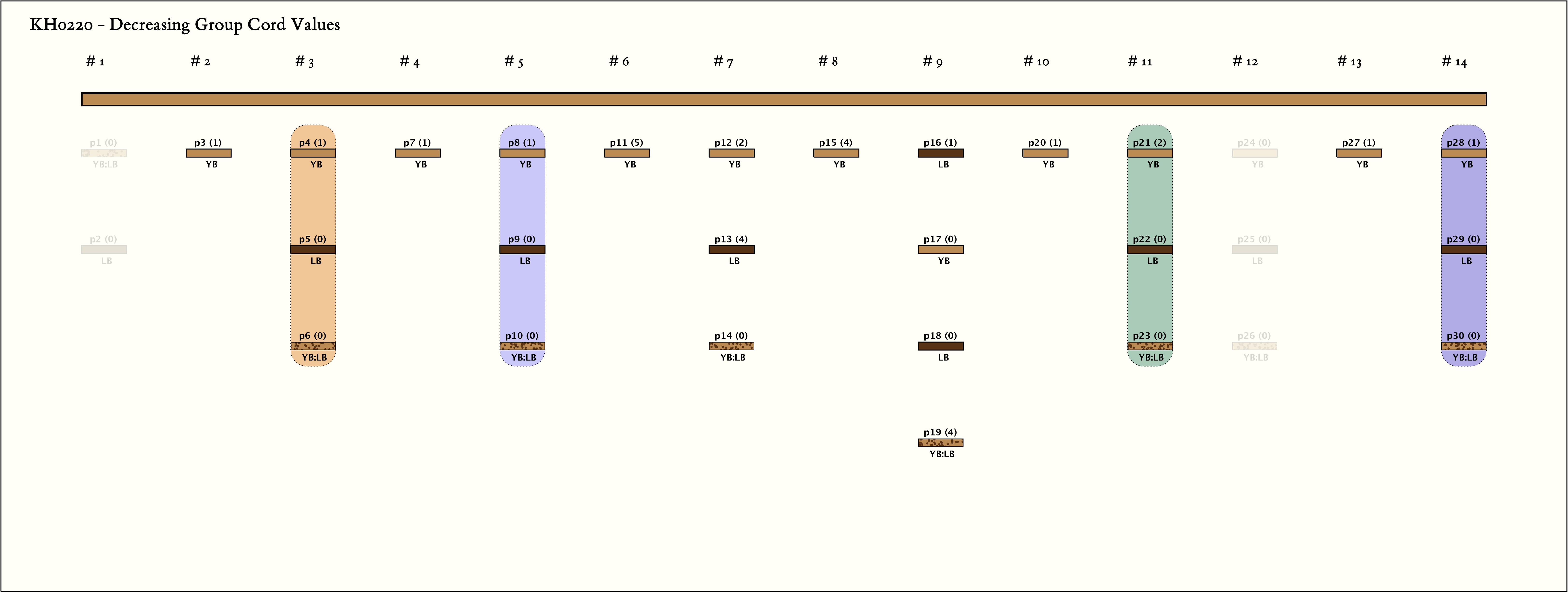 - By spacing, the khipu has eight groups of three pendants each. (The fifth group has one more pendant and the first group has one fewer. However, the rest of the first group may have been broken off.) Each group has the same color pattern YB, LB, LB:YB. (The extra pendant in group 5 is LB. The two pendants in group 1 are in reverse order, that is LB:YB, LB).