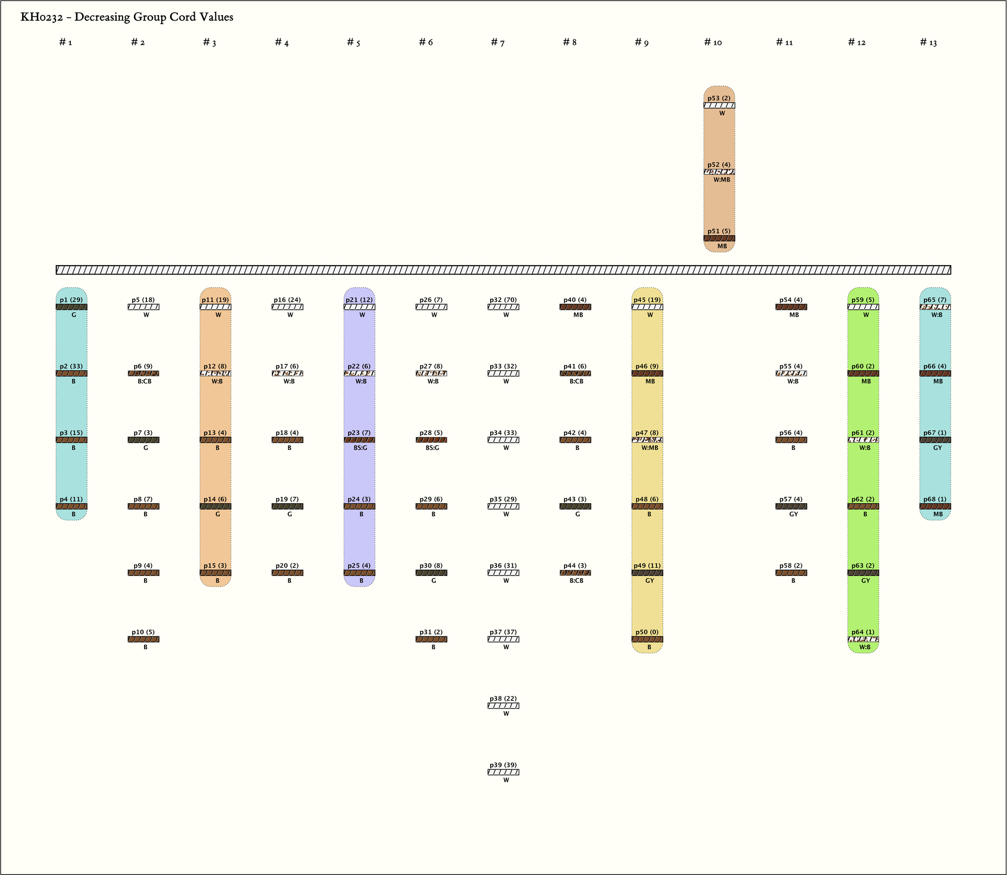 - By color, group sizes, and spaces along the main cord, the khipu resolves into five parts of 2, 4, 1, 5, 1 groups respectively. The groups each contain from 4 to 8 pendant cords. The parts, alone and in comparison, are discussed in the observations that follow.