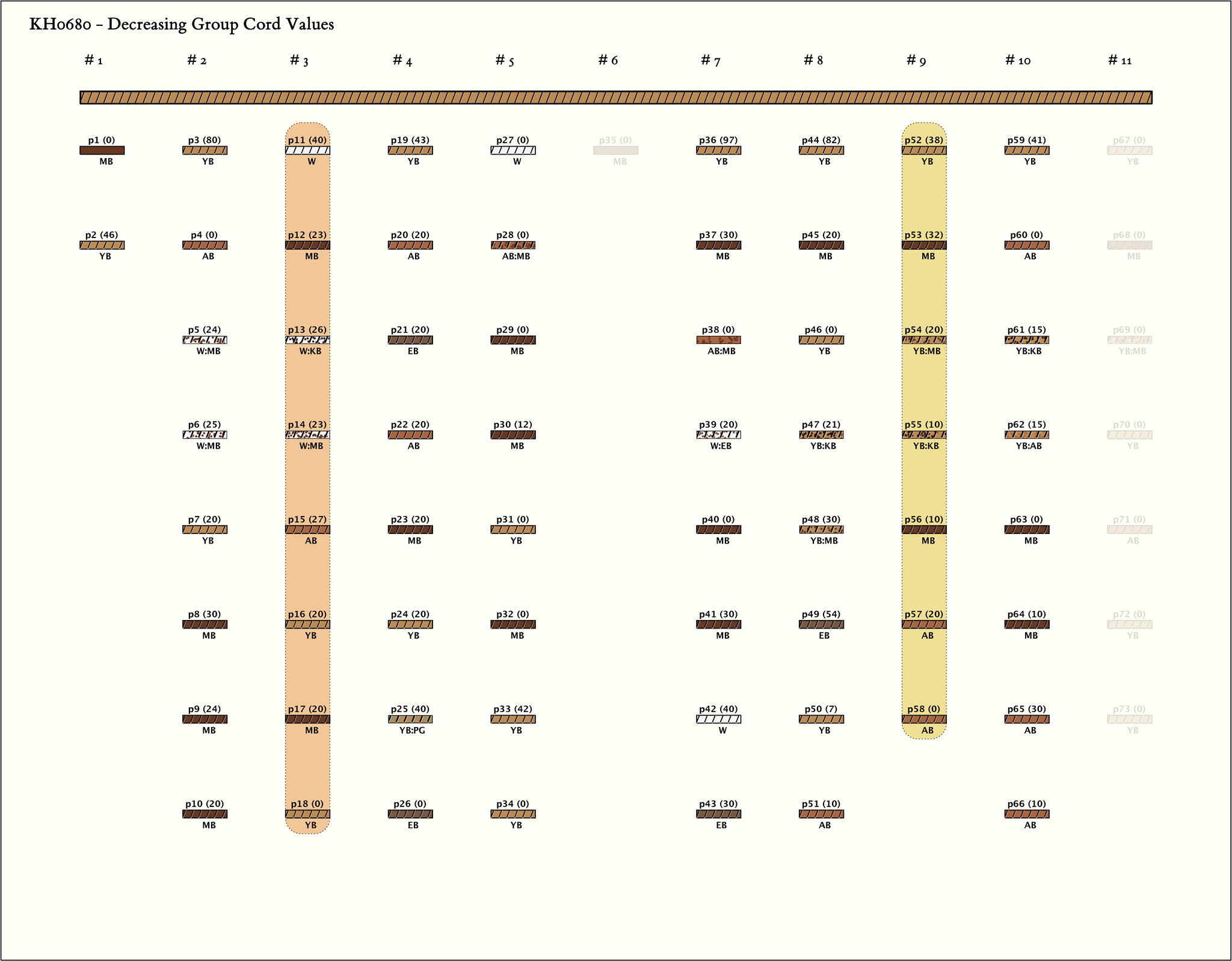 Museum Description: One of four khipus in the museum collections (three of which are on display). Displayed flat in the exhibit, in same configuration over the past several decades (lying ~flat, slight angle for viewing in waist-high glass display case in the "Kulturen der Welt" exhibit on the third (top) floor of the museum). Mounted on a cloth board with KH0680 (Gaffron collection). The khipu has a medium-thickness, solid-color primary cord. A fully detached piece of the primary cord's dangling end is displayed above the pendant section of the primary cord. An additional fragment of the primary cord is attached to the backing board near the top right corner of mounting. It appears that the portion of primary cord with associated pendants is fully preserved (as the detached section of primary cord does not have any associated pendants).