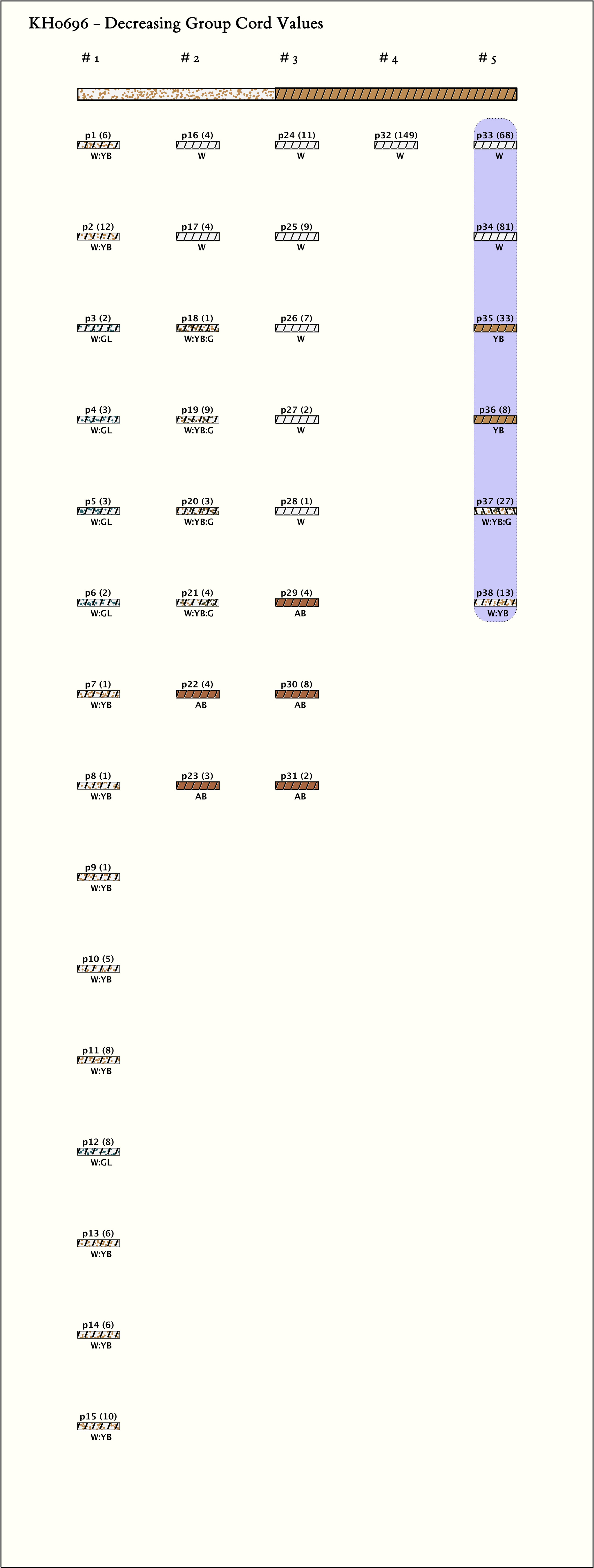 - Many plied cords, low-magnitude knots/cords, and a predominance of banding indicating a low level khipu.