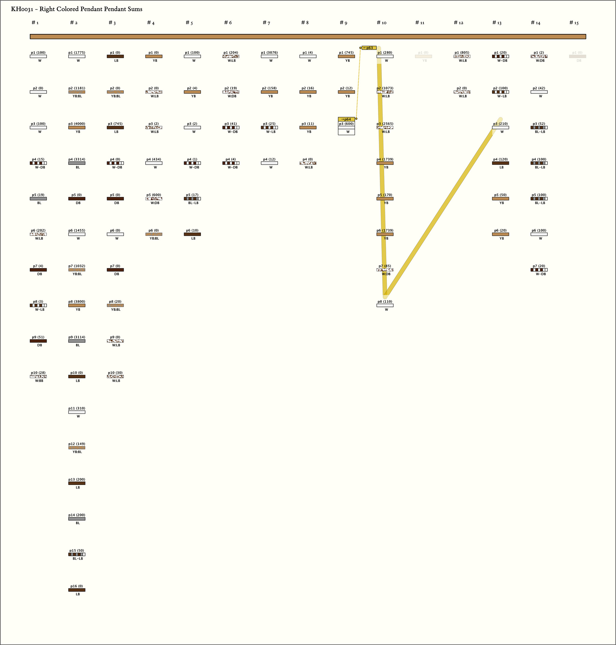 - Using 6 basic colors, 18 additional cord colors were created. DB appears alone, is twisted with W, is mottled with W, is joined with W in three different orders (DB/W, W/DB/W, DB/W/DB), is twisted with BL, and is joined with BL. The DB-BL twist is joined with W and is joined with DB, while the DB-W twist is twisted again with DB, and the mottled DB:W is joined with DB. LB appears alone, is twisted with W, is joined with W in two different orders (LB/W, W/LB), is twisted with BL and is joined with BL. YB appears alone, is mottled with W, and is mottled with BL. BL and W each appear alone as well as in the combinations described above. BB only appears alone.