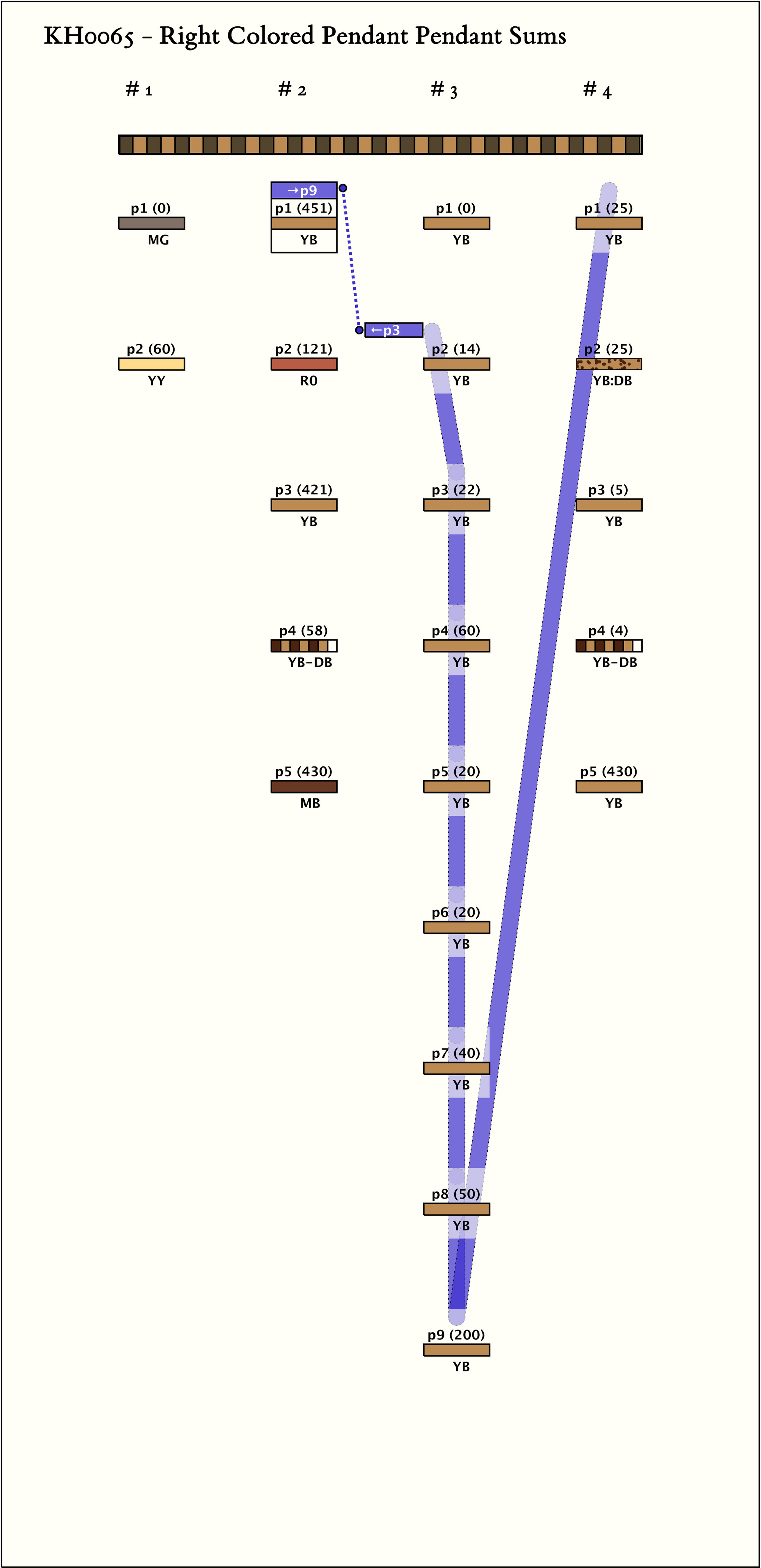 - There are 4 groups of 2, S, 9, 5 pendants by spacing. Group 3 has all pendants of one color. Groups 2 and 4 have the same number of pendants, the same color pendants in positions 1 (YB) and positions 4 (DB-YB), and the same value (430) in the last position.