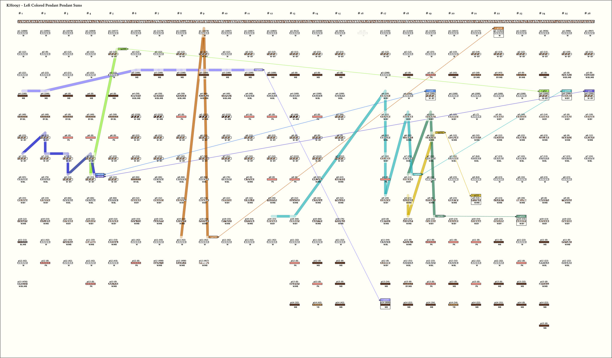 - At first glance, the groups seem to vary in size and color pattern. However, when viewed as groups of 15 pendants with some positions non-existent in each group, the colors and values are repetitions. The 25 groups of 15 pendants have been arranged in a rectangular table (see Table 1). A blank means the position is non-existent, an M is a missing pendant, and a ? indicates that the pendant is broken so the value is unknown. An unequal sign ≠has been used to mark a change in color. Where there is no color change, but just a color anomaly, the value has been grouped with parentheses i.e. (39). Observe from the table that although similarities remain, there are decided differences between part 1 (groups 1-15) and part 2 (groups 16-26). Also, within part 1, there are several changes after the 5th group and after the 12th group.