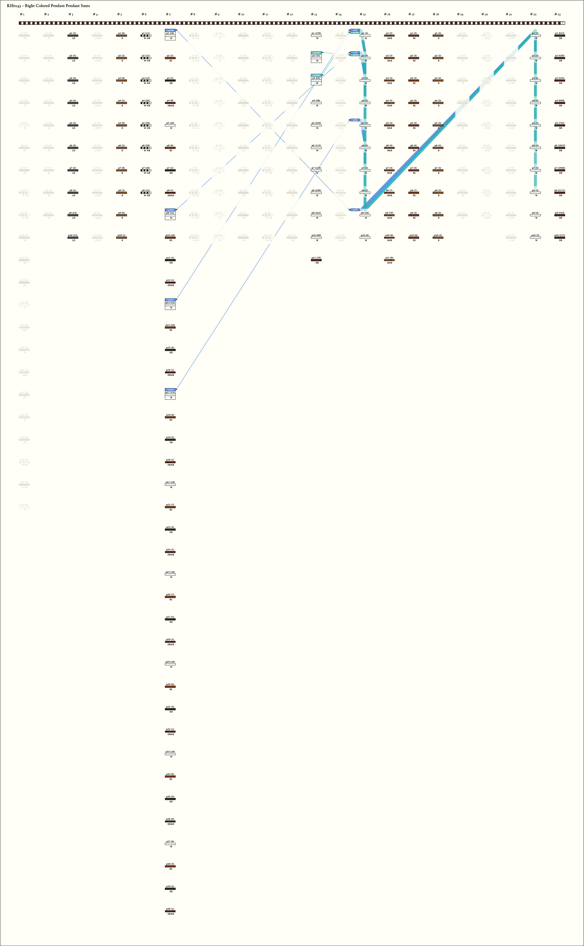 - The 40 pendants in part 3 repeat the color pattern W, BS, 0D, DB:KB 10 times. The only subsidiaries are on the BS colored pendant and all are DB:W. For each of the 10 sets of 4 pendants, the values have the same relative magnitude: W > BS > 0D ≥ DB:KB.