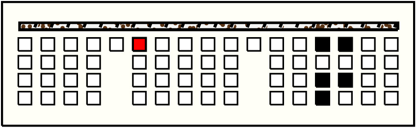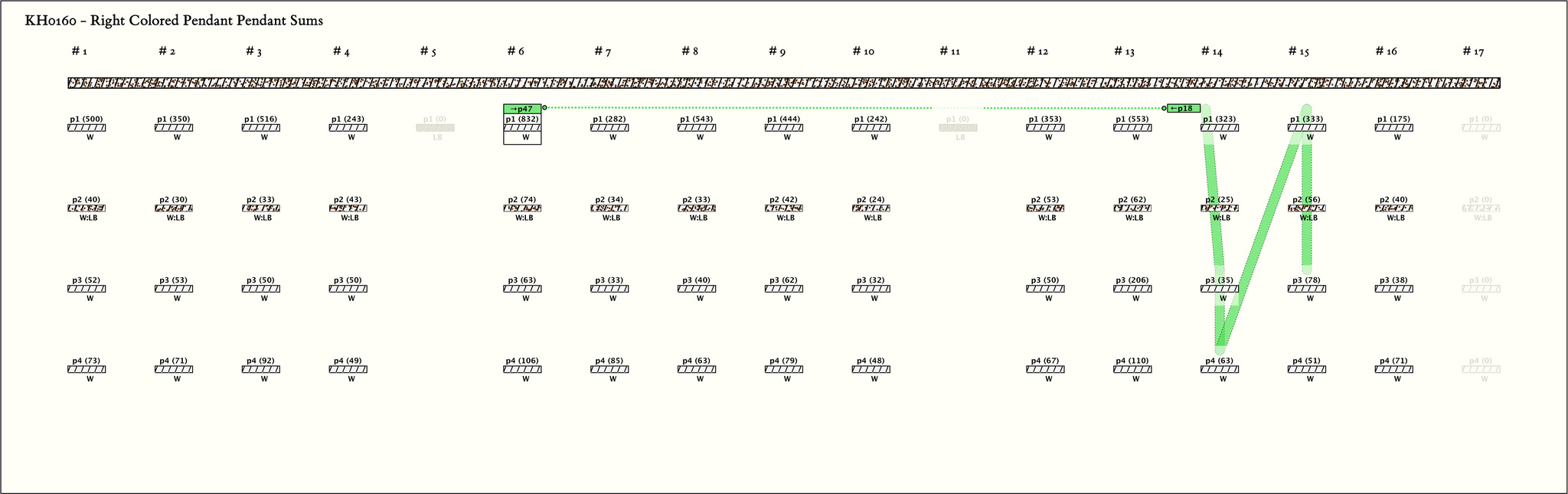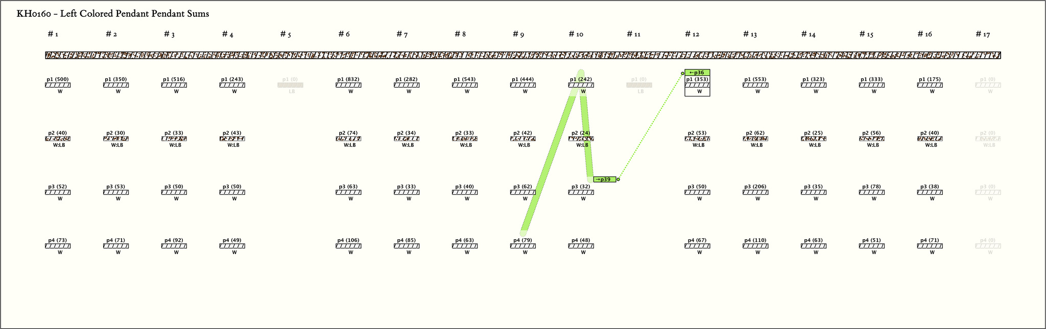 - By spacing and markers, the khipu is separated into 4 parts. The first part is 4 groups, the second and third parts are 5 groups each, and the last part is 1 group. All groups have 4 pendants with the same color pattern: W, LB:W, W, W.