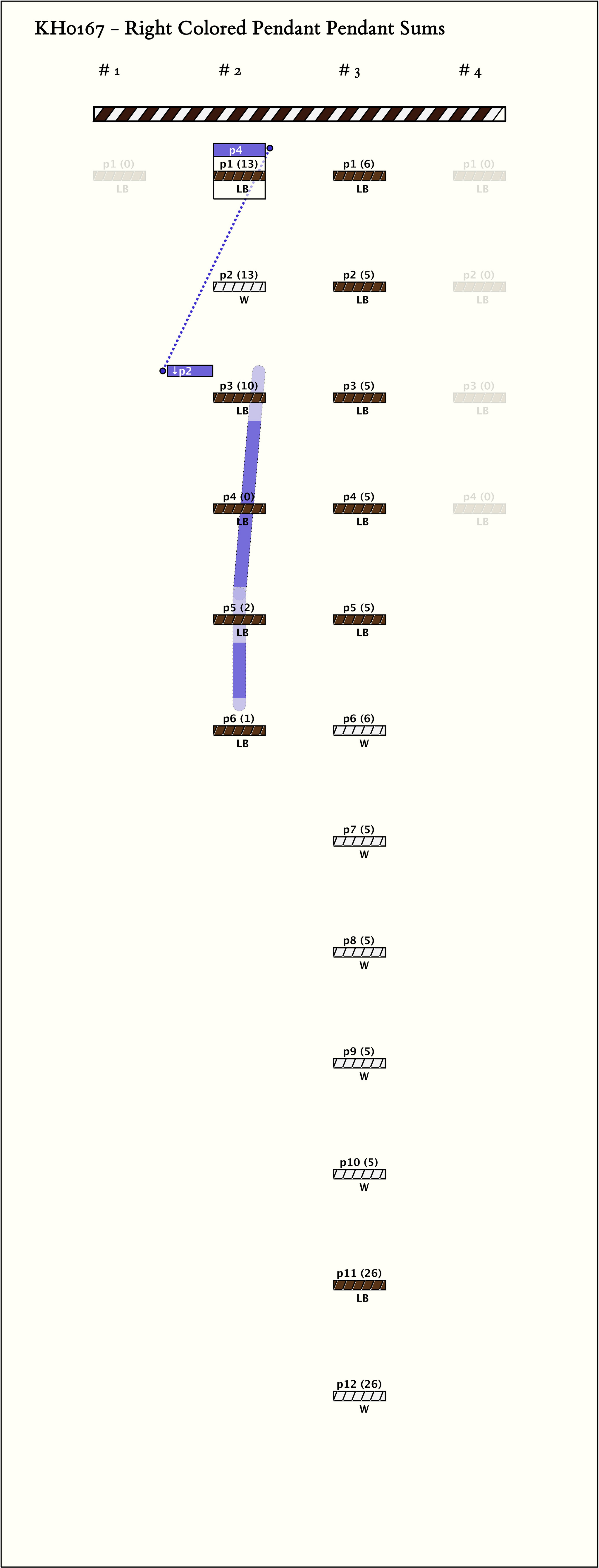 - The 12 pendants of group 3 are 5 LB pendants with LB subsidiaries, then 5 W pendants with W subsidiaries, and then 1 pair of pendants LB, W each with a subsidiary of the same color. The first 5 LB pendant values sum to 26; then the 5 W pendant values sum to 26; and each of values in the last pair is 26. Excluding subsidiaries suspended from subsidiaries rather than from pendants, the subsidiaries also sum to 26.