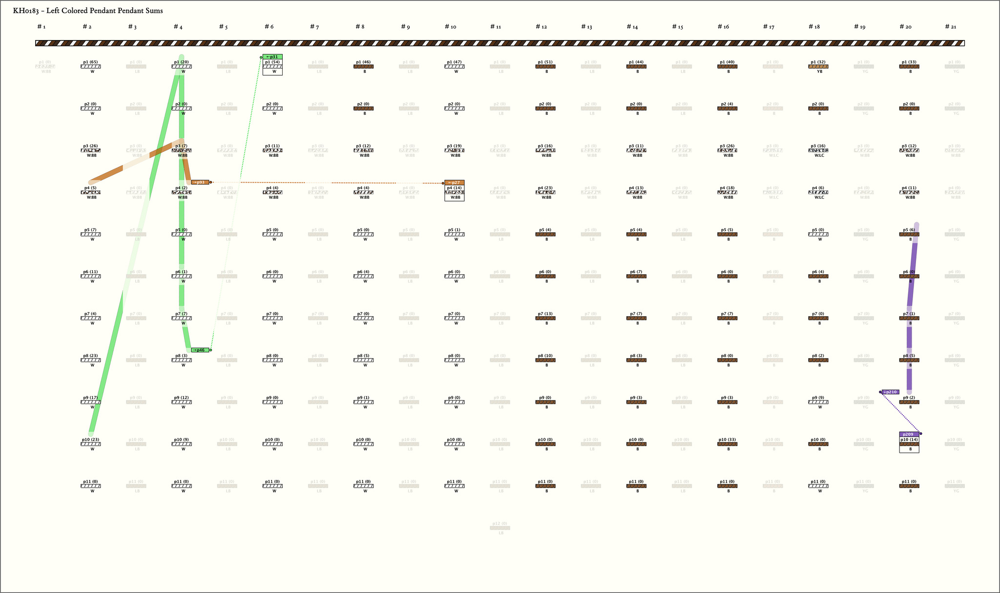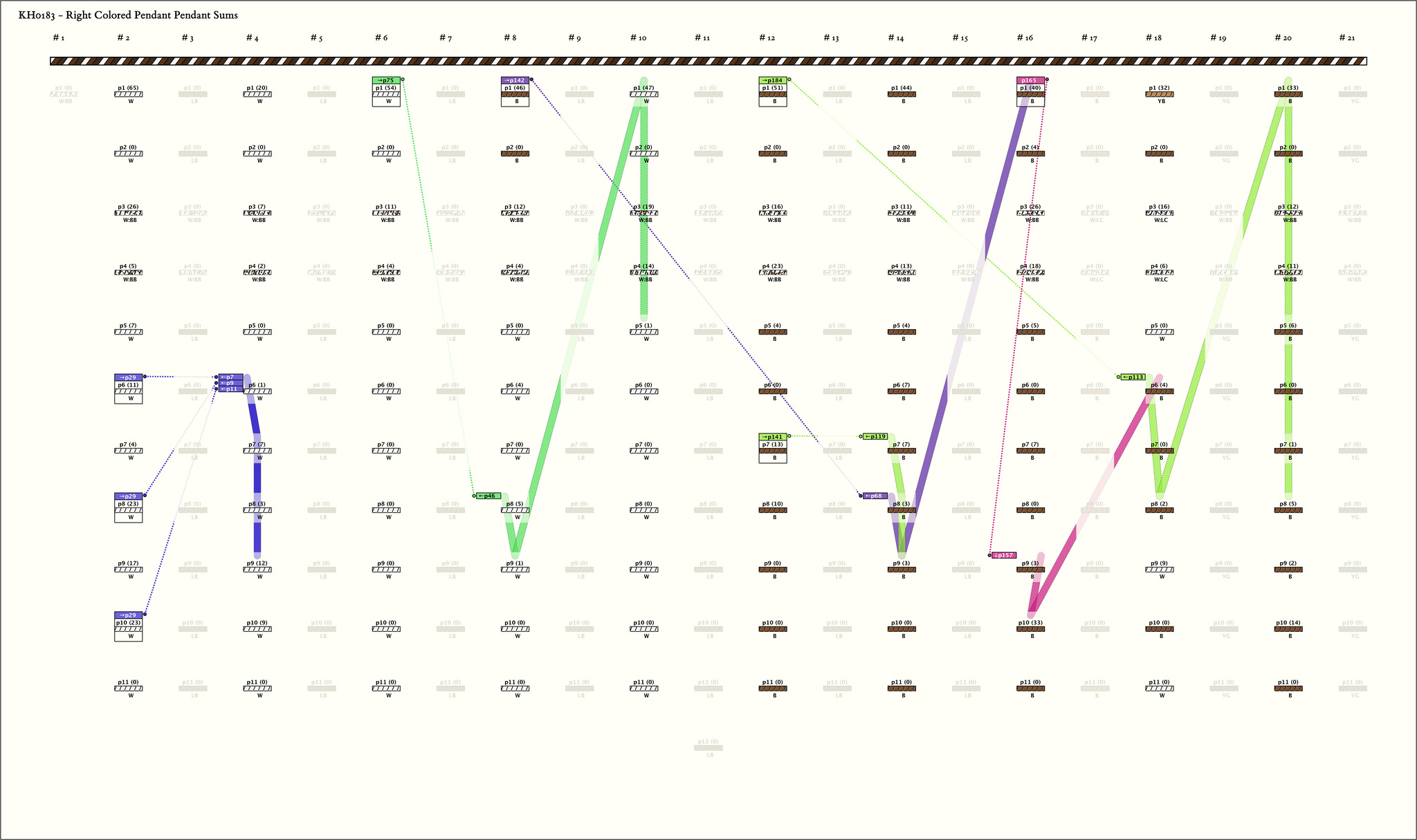 - With the exception of groups 7 and 17 (the 7 th group in each part), each group has the same patterning of colors: 2X, 2Y, 7X, Y is BB: W in all groups except groups 16 and 17 in which it is LC:W. The X varies so that the group colors alternate. In the first part (with the exception of 2 pendants in group 7), X is W in groups 1, 3, 5, 7, and 9 and it is LB in groups 2, 4, 6, 8, 10, In the second part: X is B in groups 11, 13, 15, 19; LB in 12, 14, 16; and YG in 18 and 20.