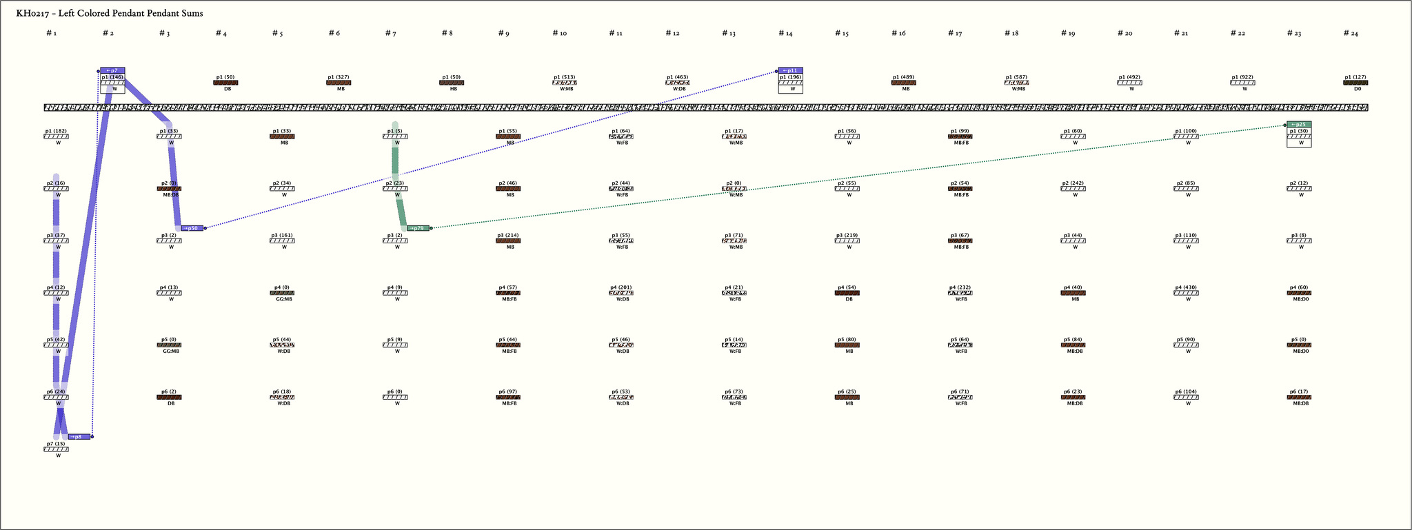 - Within groups 1, 4, and 11, all pendants and the top cord are the same color. Within groups 5, 6, 7, and 9, the first 3 pendants are one color, and the next 3 are another color. In 3 of these 4 groups, the top cord color differs from both the pendant colors. Within groups 8, 10, and 12, the first 3 pendants are one color and the next 3 are mixed. Within groups 2 and 3, the pendant colors are mixed. In 4 of these latter 5 groups, the top cord is one of the colors in the pendant group.