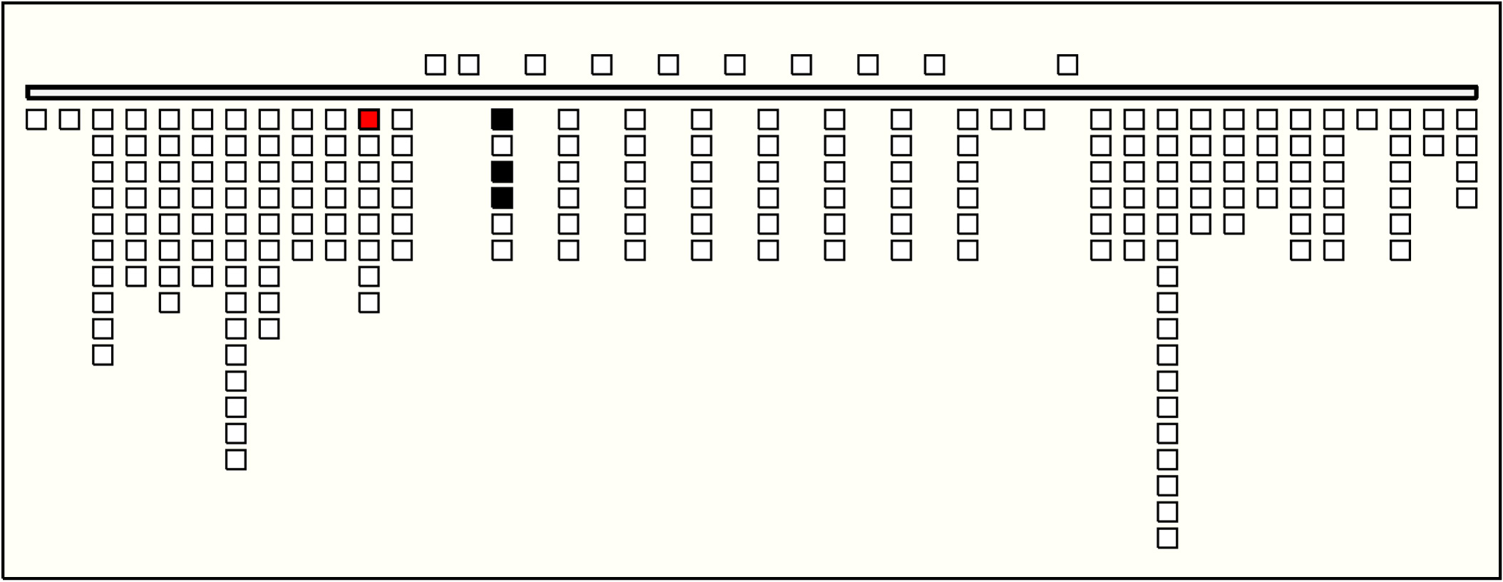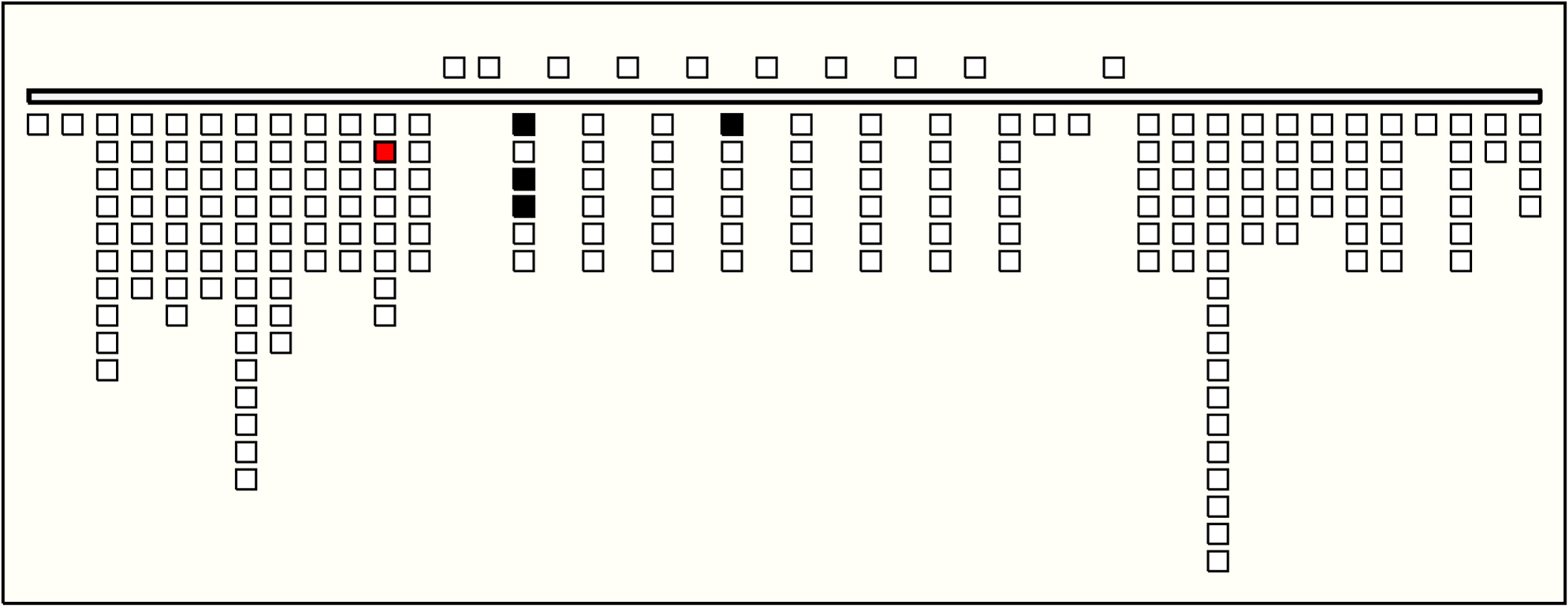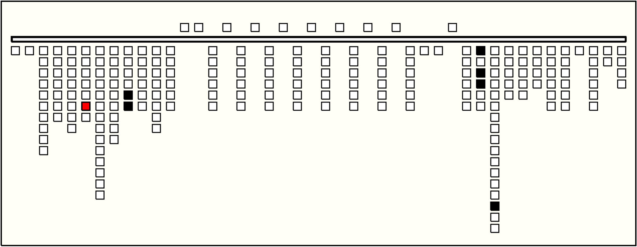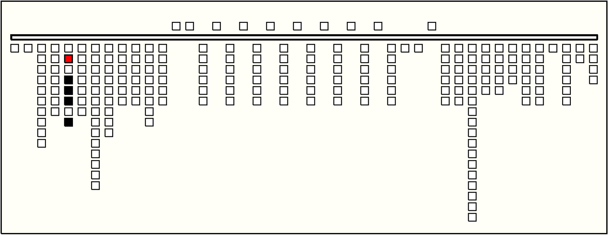 - The values on Groups 2 to 10 are quite similar. On all, position 1 has value 1; position 2 is zero-valued; position 3 has value 0, 1, or 2; position 4 has value 9; position 5 is zero-valued; and position 6 has value 0, 1, 2, or 3. The third position is the only one with subsidiaries. In each group it has 1 or 2 subsidiaries, one or none of color CB (values unknown as always broken ), and one of YB or MB (values 0, 1, or 2). Group 1 sums Groups 2-10. The summation is exact in 5 of the 6 pendant positions and off by 2 in position 4. It is also exact on one of the subsidiary positions and, due to breakage, unknown on the other. So: