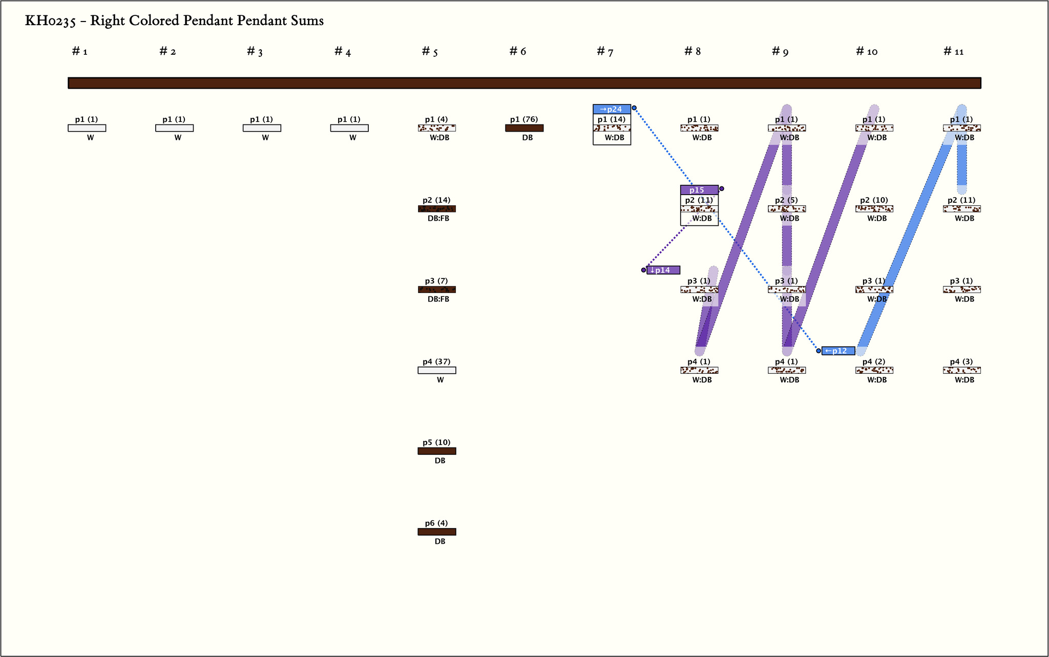 - The subsidiaries on the top cord probably sum the subsidiaries on the pendant cords but three values are in doubt due to breakage. The two W subsidiaries on the second pendant sum to at least 10 and another on the fourth pendant has value 2. A DB subsidiary on the third pendant has value 3 and an FB subsidiary on the fourth pendant is broken. These can be associated respectively with the following top cord subsidiaries: a W with value 13, a U with value 2, and a DB with value 4.