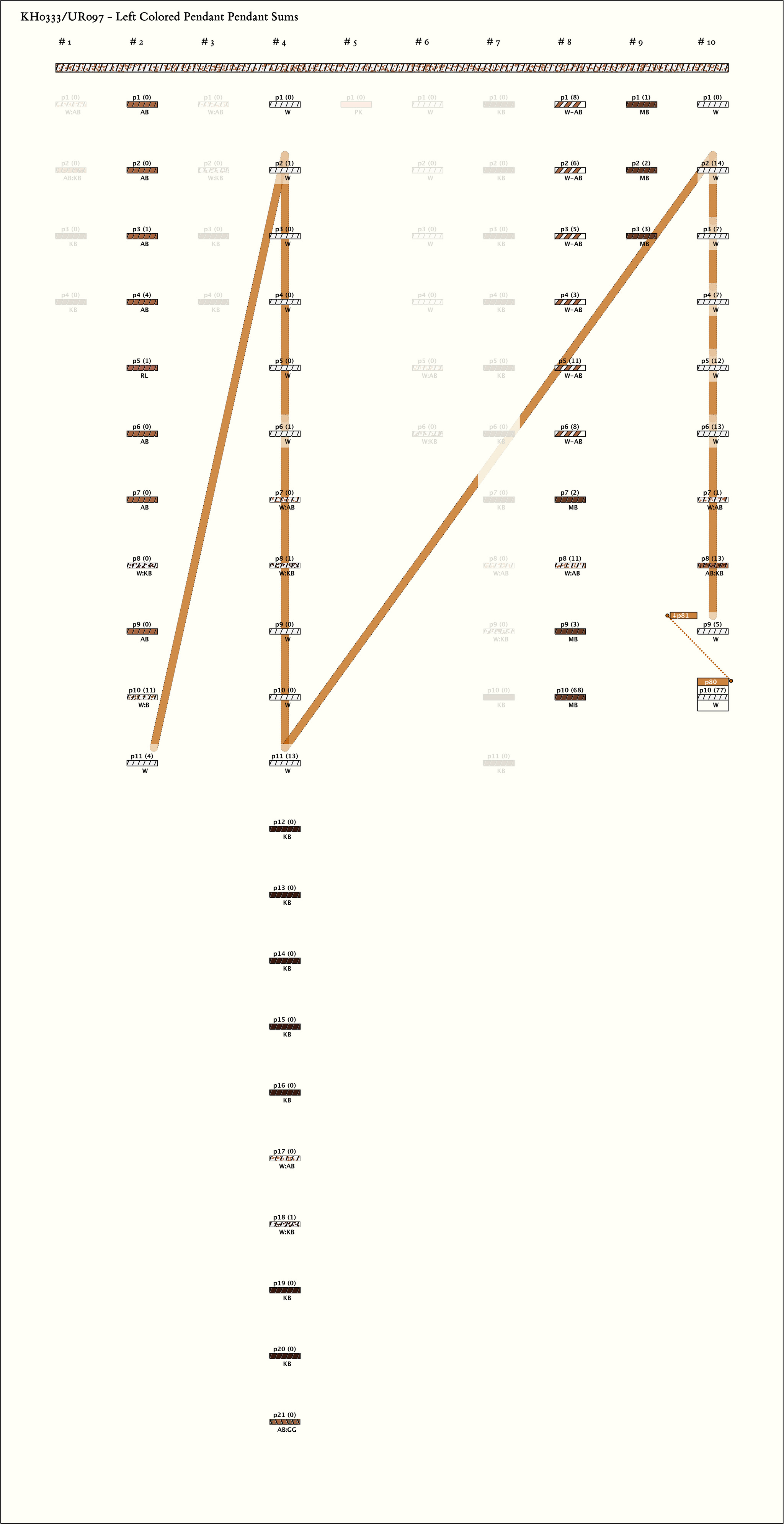 The pink (PK) string with a white section are remarkably consistent in color positions. (eg pendants 17s2, 22s1, 23s1...) There is no evidence of splicing; rather the cords suggest resist dyeing (links to Nazca or Charcay?)