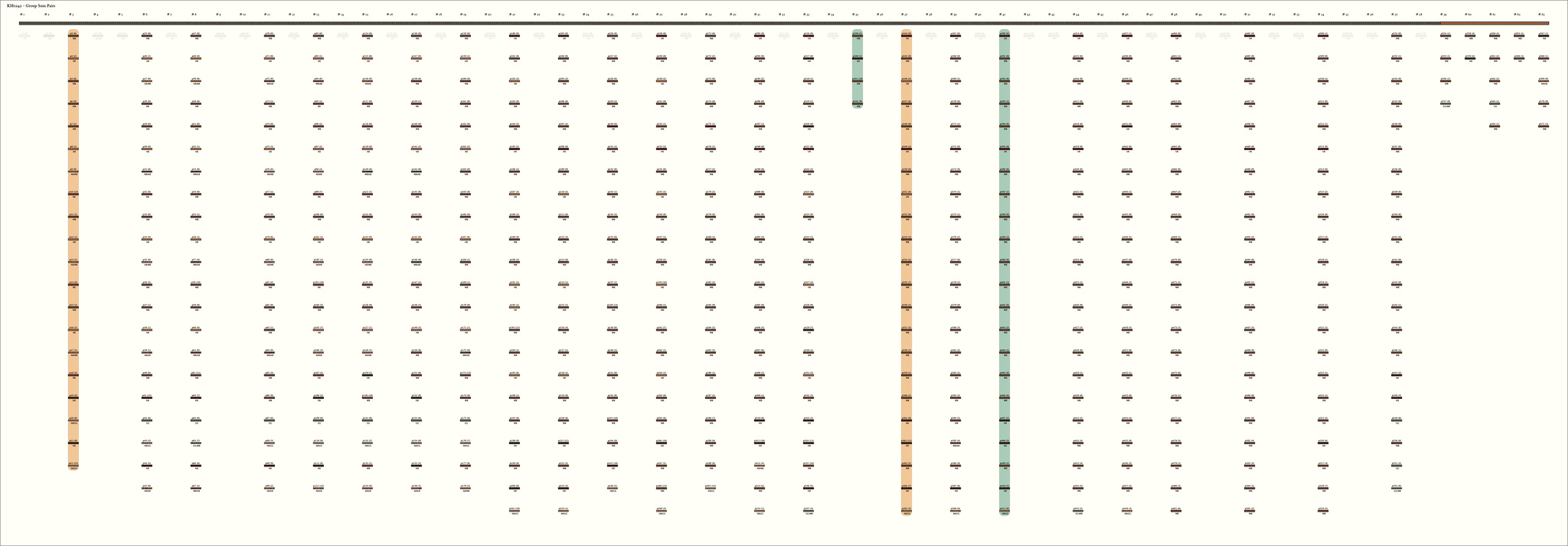 Before proceeding, I should note that in the calendrical analysis of khipu KH0242 that I will present in this section, I will disregard the 32 pendant strings on this sample that do not conform to the regular arrangement of paired-that is: [20, 21, 22] + [8, 9, 10] sets of pendant strings as outlined above. The excluded pendant strings are Clusters #59-#63 at the right end of the primary cord - AMK. The knot counts on these excluded strings will come into play later in my analysis. I believe that these strings, which do not conform to the pattern of paired sets, may have been used, in some manner that I do not entirely understand at present, to provide flexibility in relation to one of the principal uses of this khipu-that is, as a biennial calendar.