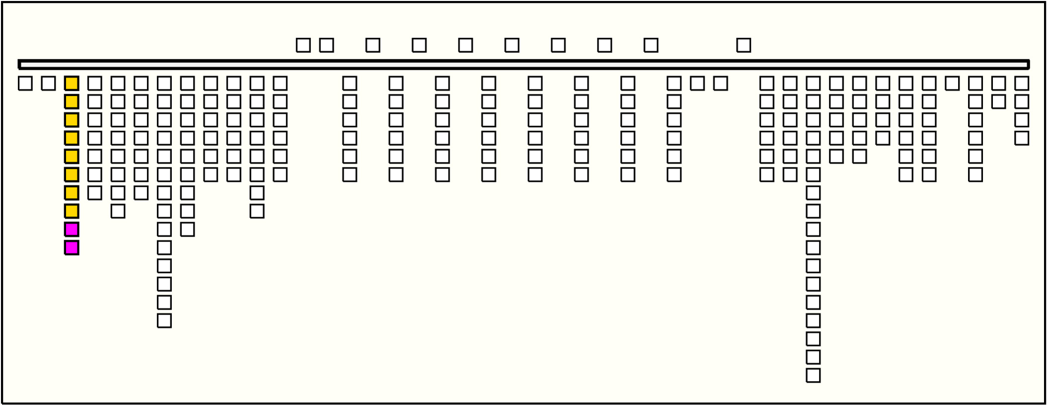 - The values on Groups 2 to 10 are quite similar. On all, position 1 has value 1; position 2 is zero-valued; position 3 has value 0, 1, or 2; position 4 has value 9; position 5 is zero-valued; and position 6 has value 0, 1, 2, or 3. The third position is the only one with subsidiaries. In each group it has 1 or 2 subsidiaries, one or none of color CB (values unknown as always broken ), and one of YB or MB (values 0, 1, or 2). Group 1 sums Groups 2-10. The summation is exact in 5 of the 6 pendant positions and off by 2 in position 4. It is also exact on one of the subsidiary positions and, due to breakage, unknown on the other. So:
