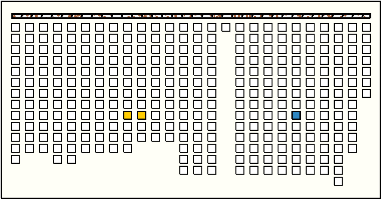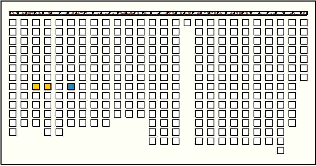 - By spacing, the khipu is separated into 25 groups but ends with a break in the main cord at the middle of the 25th group. A marker on the main cord separates the first 15 groups from the last 10 groups.