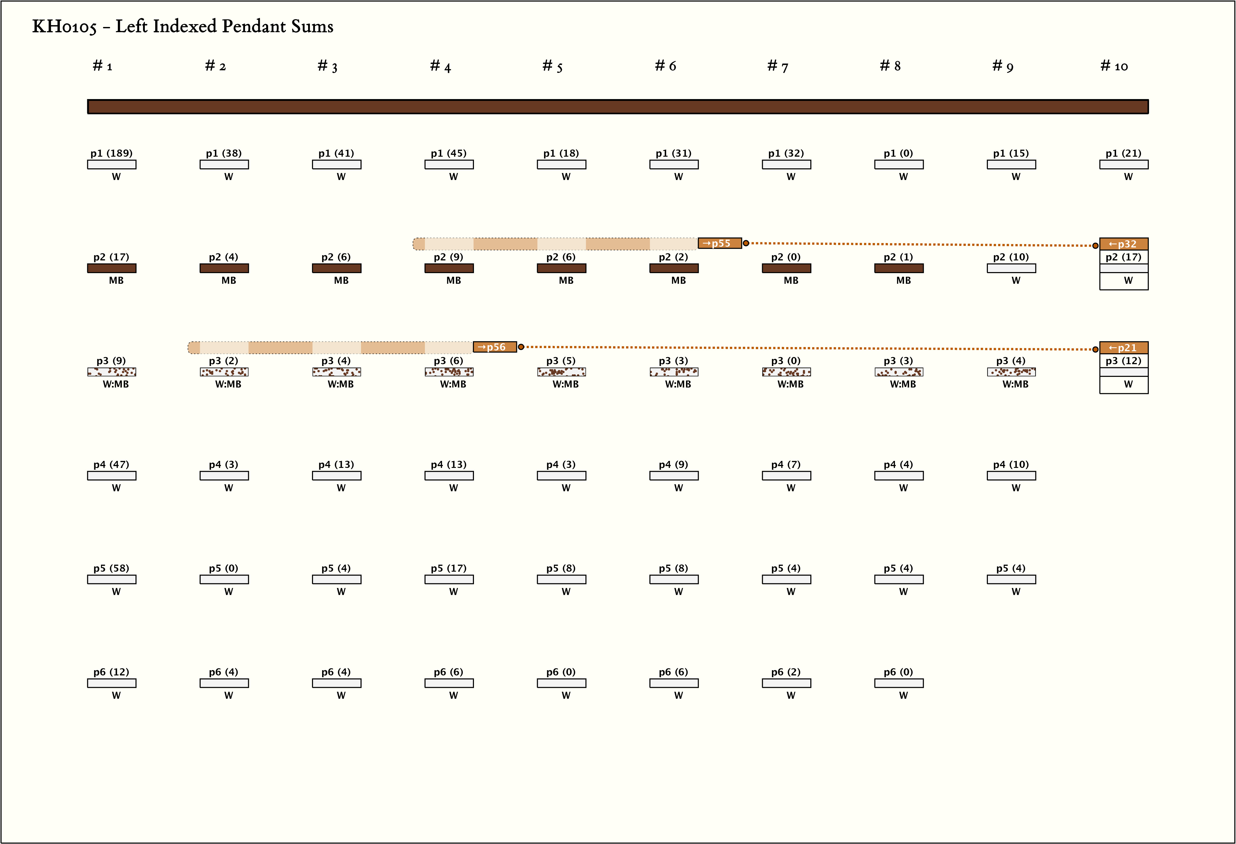 - By spacing, KH0105 is separated into 10 groups. The first 8 groups each have 6 pendants with the same color pattern (W, MB, MB:W, W, W, W).