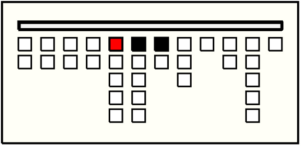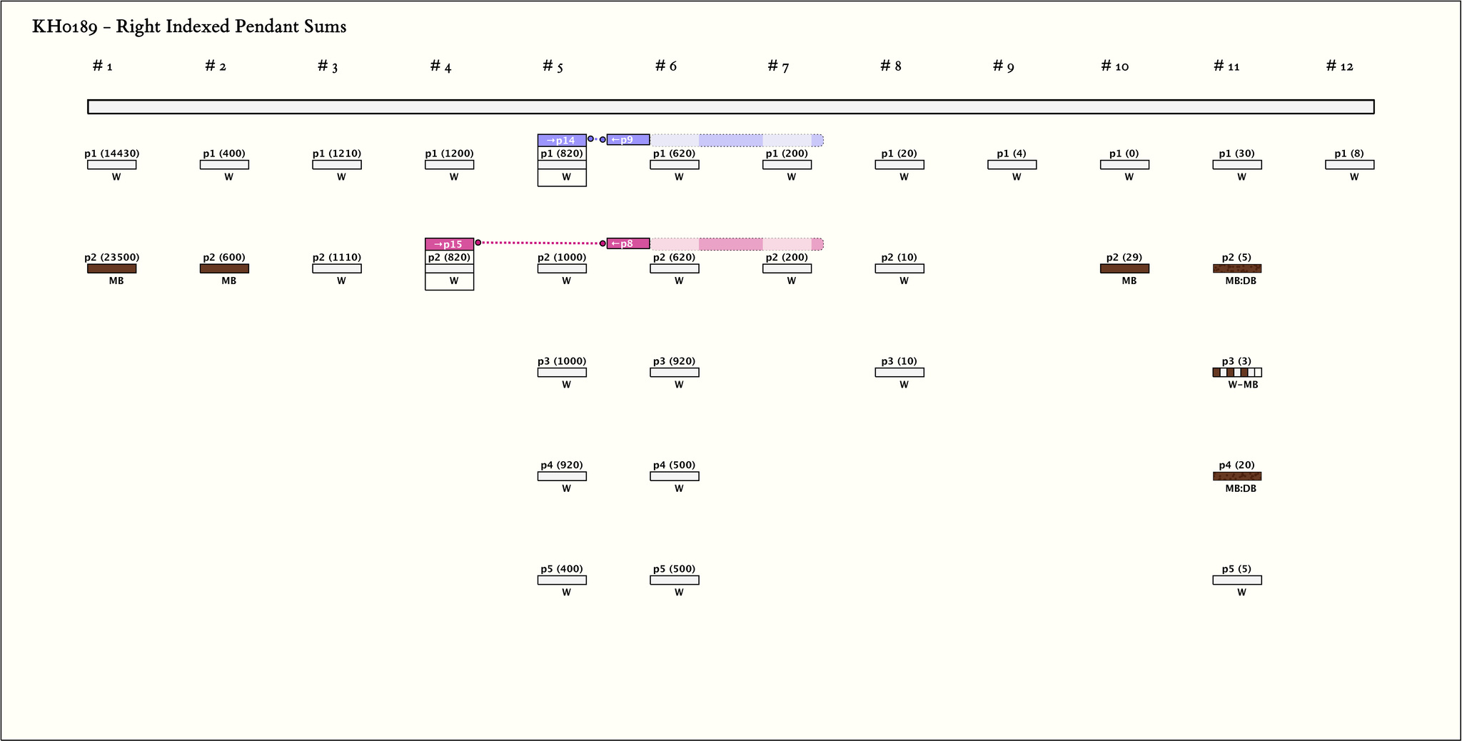 - By spacing, the first part is separated into 2 sets of 2 pairs, then 2 groups of 5 pendants each, and then another pair. The first 2 pairs alternate in color: W, MB, W, MB. The rest of the pendants (with the exception of the last one) are W with an MB subsidiary.