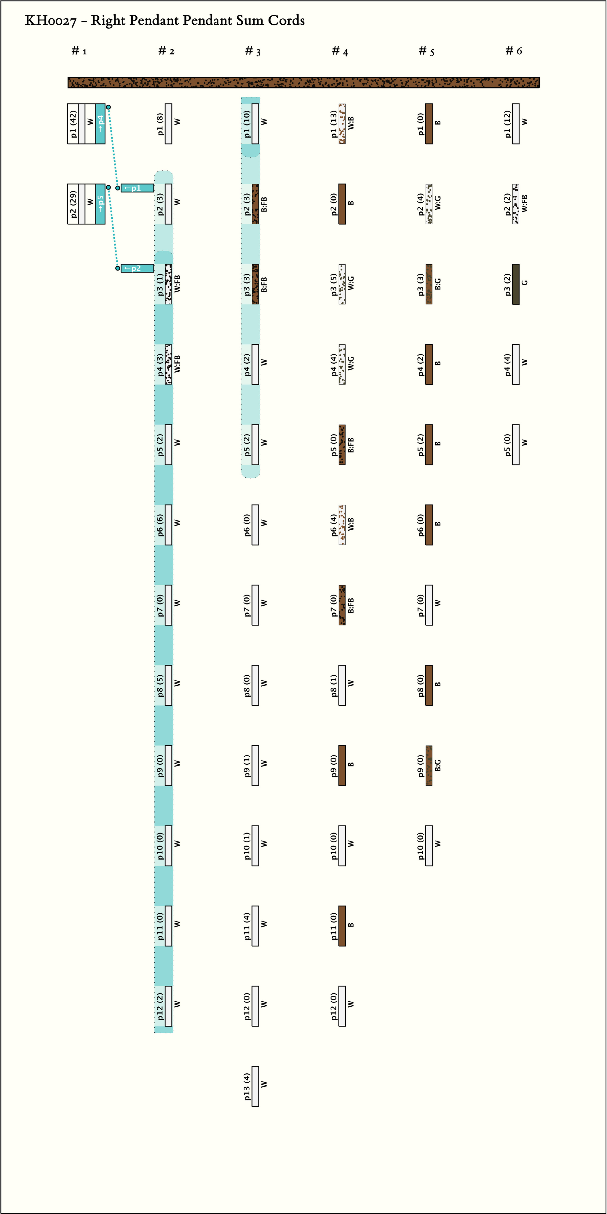 - By spacing, KH0027 has 6 groups of 2, 12, 13, 12, 10, 5 pendants respectively. The order of magnitude of the values in the first group (29-49) is greater than the values in the other groups ( 0-13). Within the other groups, values in position 1 are 8-13 while values in all the other positions are restricted to 0-6.
