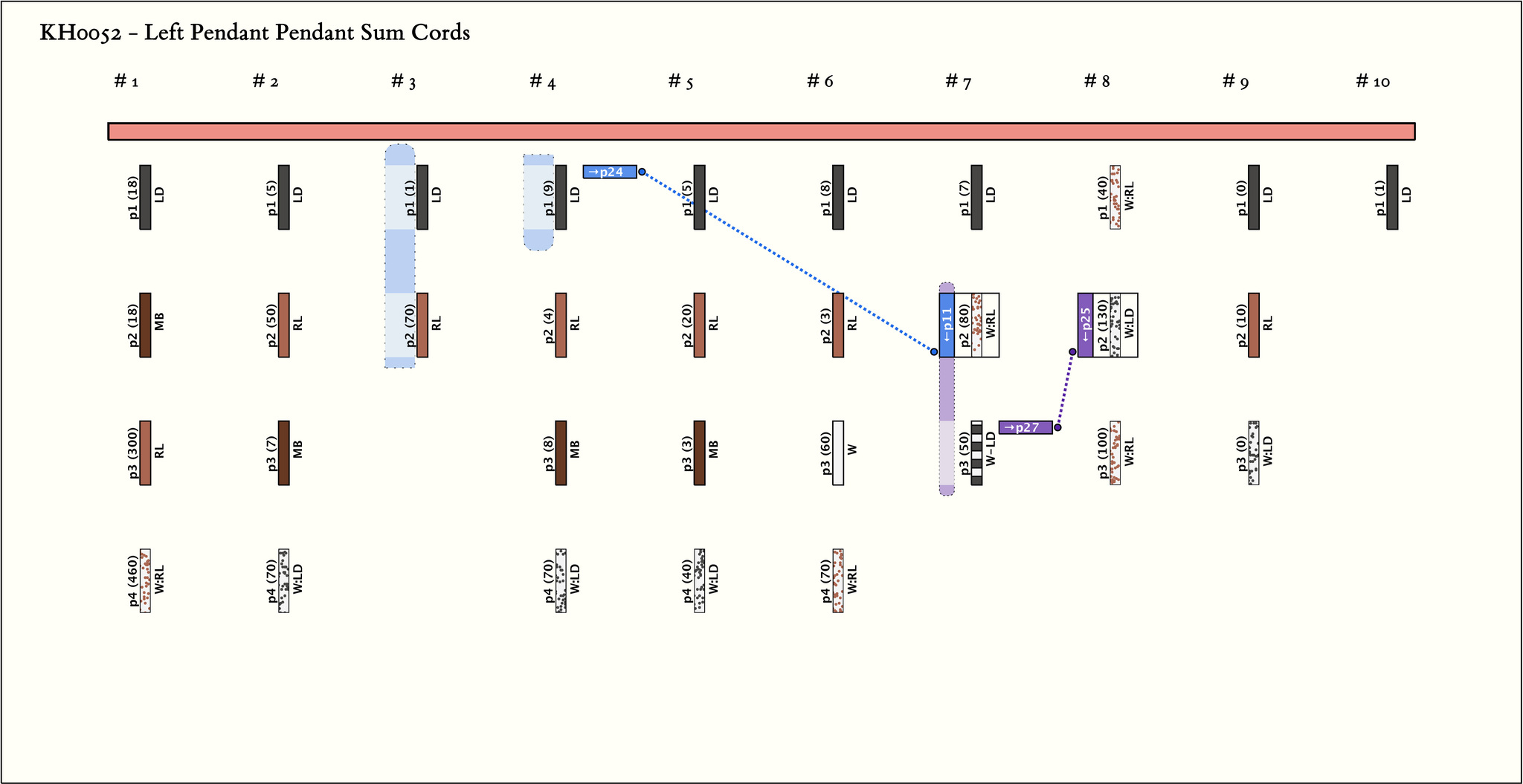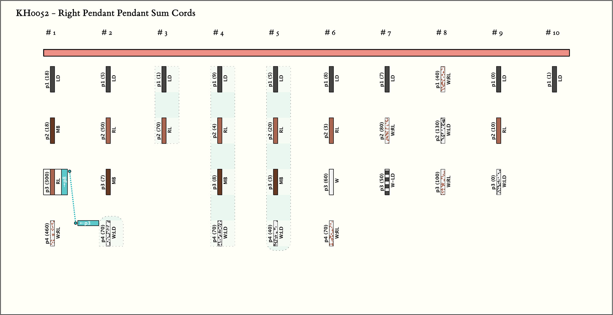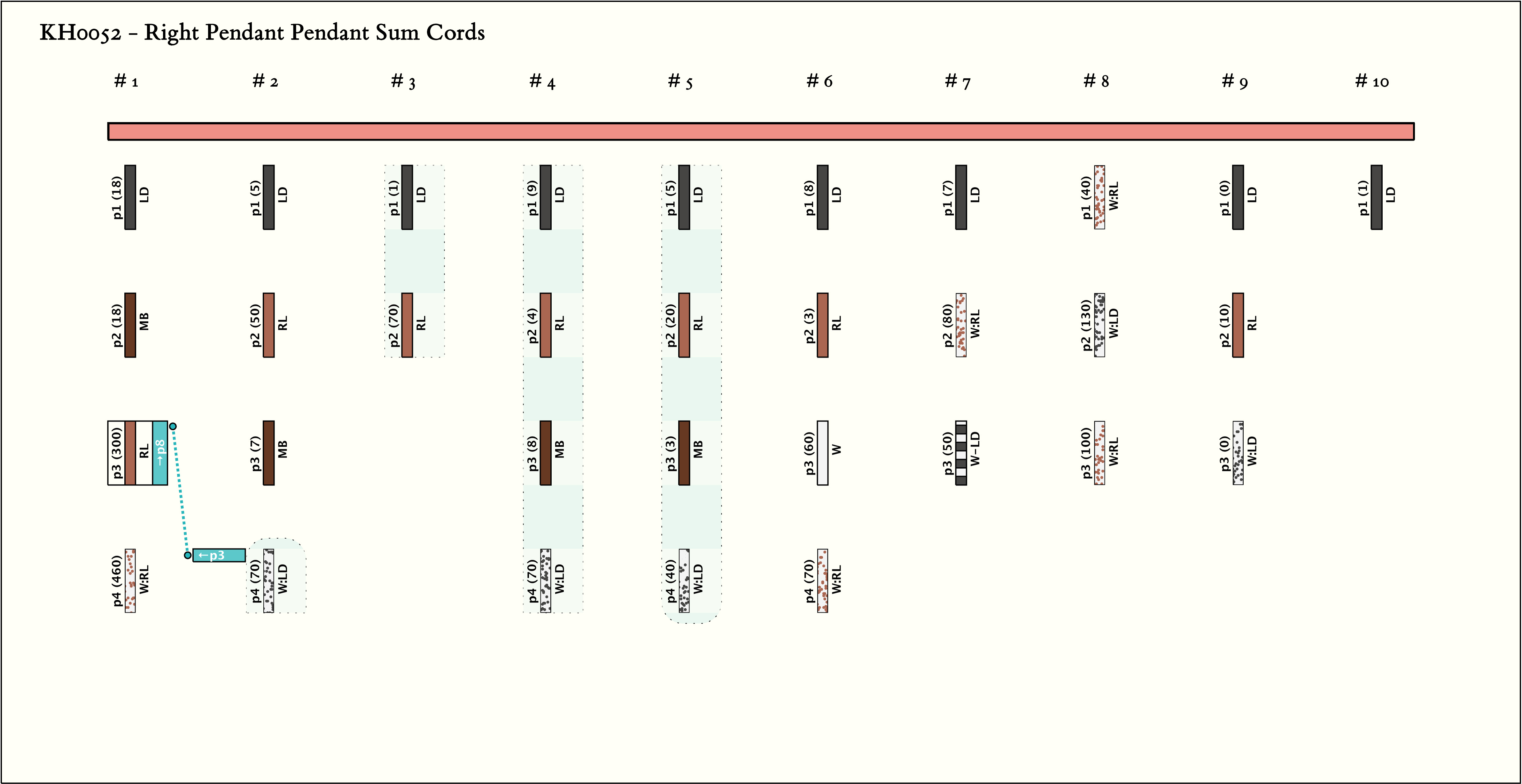 - By spacing there are 10 groups of 4, 4,2, 4, 4, 4,3, 3,3, 1 pendants. There is some consistency of color pattern. LD appears in 9 of the 10 groups in position 1 and in no other positions.