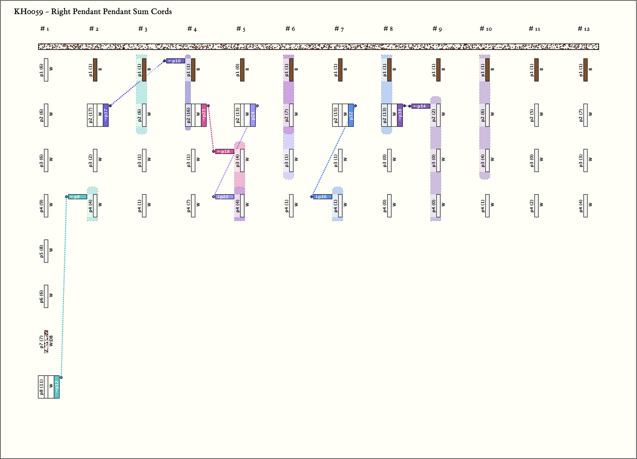 - The khipu has 12 groups by spacing. The last 11 groups each have 4 pendants and the same color pattern (B, W, W, W). For all 11 groups: