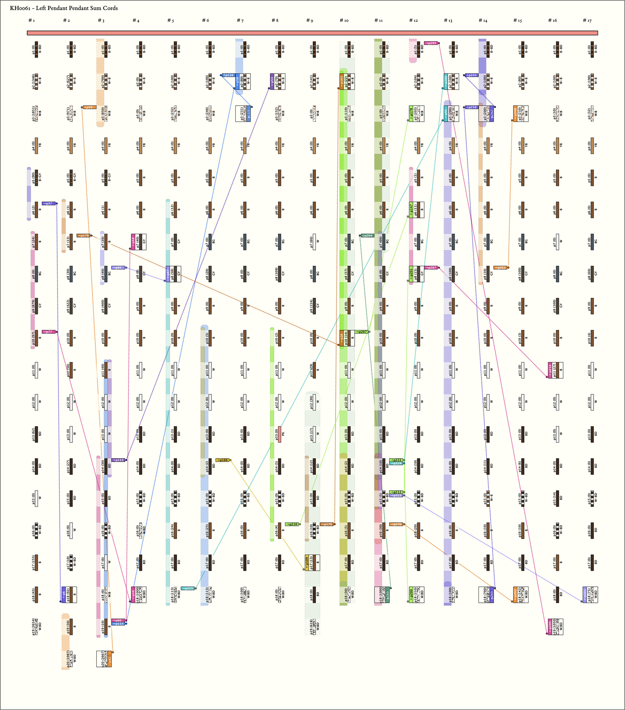 - Part 1: Assuming that position 10 in group 1 is non-existent, this part consists of 3 groups of 20 pendants each. The color pattern is the same for all 3 groups (with the exception of position 17 in group 3). In all 3 groups, subsidiaries appear only in positions 3, 8,9, 11, 14, 15, 16, 18, 19, 20.