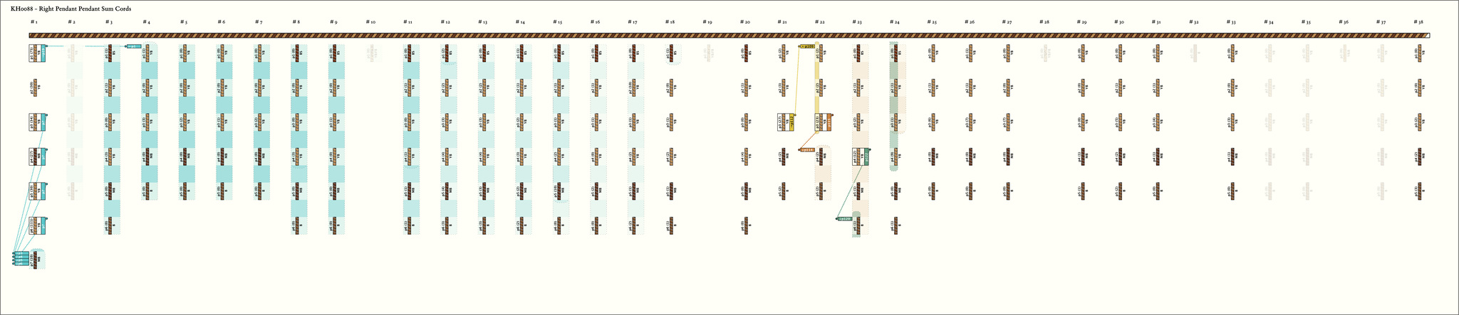 - By spacing, color pattern, and markers 1, 2, 3, the khipu is separated into 5 parts: Part I consists of 1 group of 7 pendants and Parts II, III, IV, Veach consist of 8 groups of 5 or 6 pendants each.