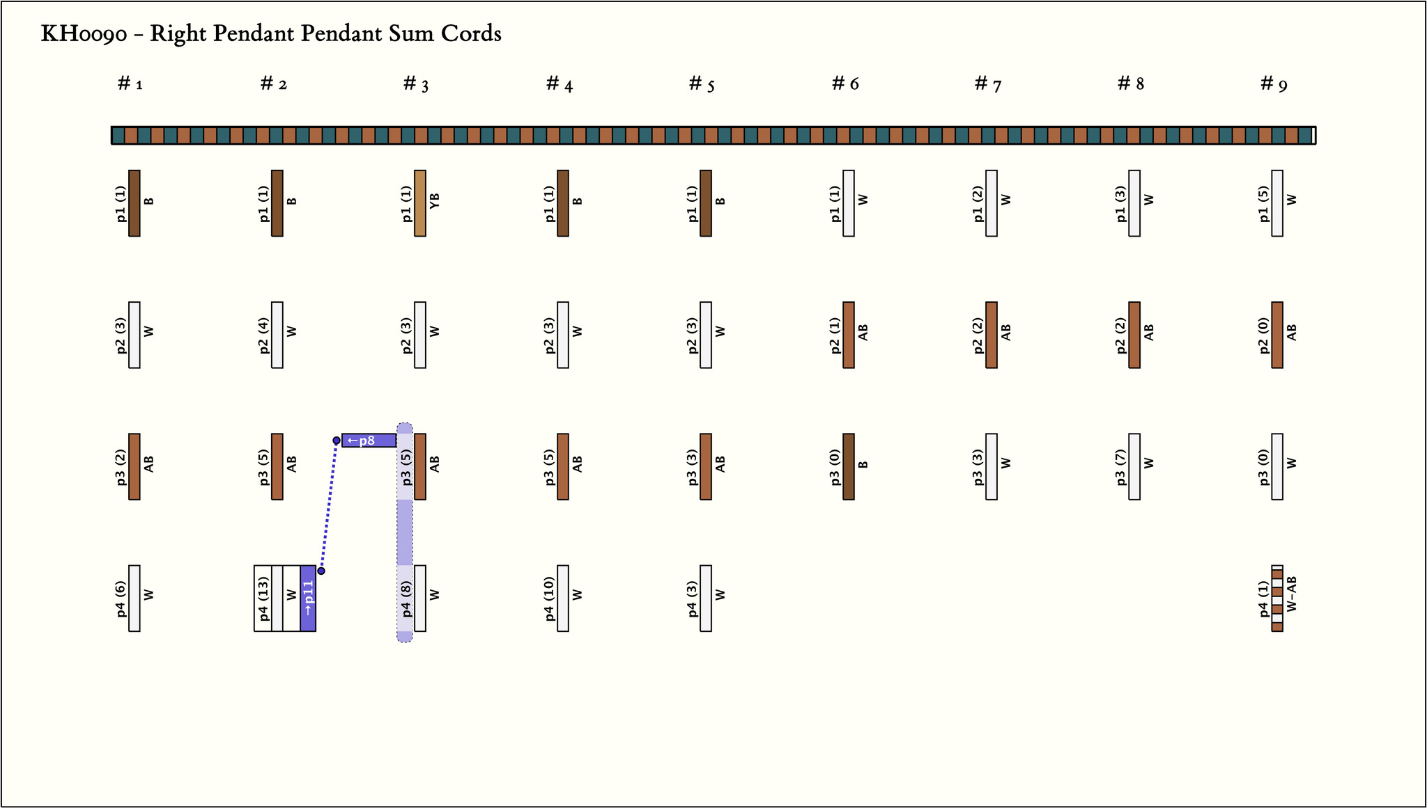 - In the first 5 groups, long knots and figure eight knots appear in two knot positions on the first 3 pendants of each group. On the 4th pendant in each group, there is the usual knot usage (single knot clusters in higher positions and long knots or figure eight knots in the units position). Where double unit values appear, the higher value is a 1 and the lower values are 0-4. The last 4 groups have no double unit knot positions.