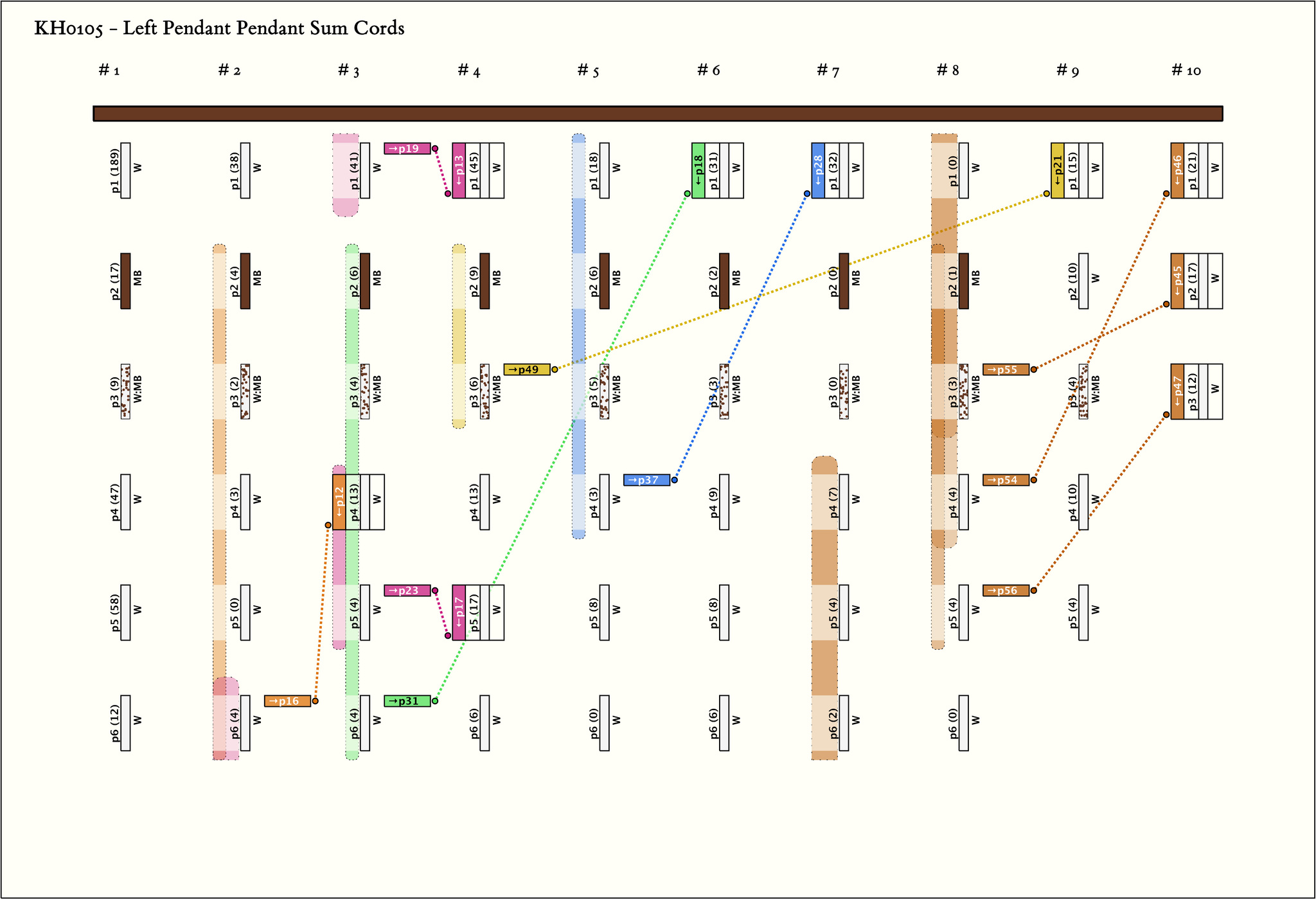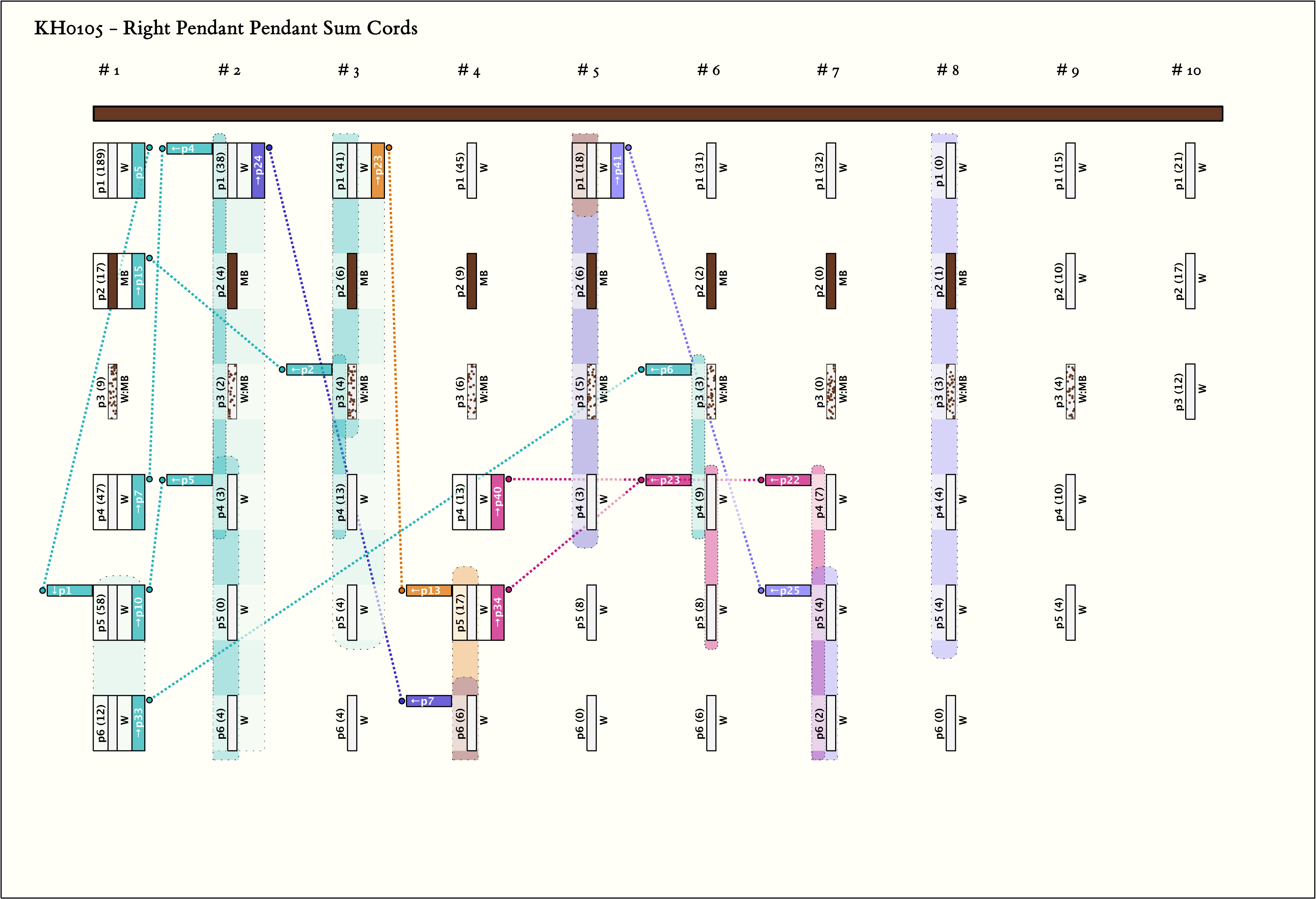 - By spacing, KH0105 is separated into 10 groups. The first 8 groups each have 6 pendants with the same color pattern (W, MB, MB:W, W, W, W).
