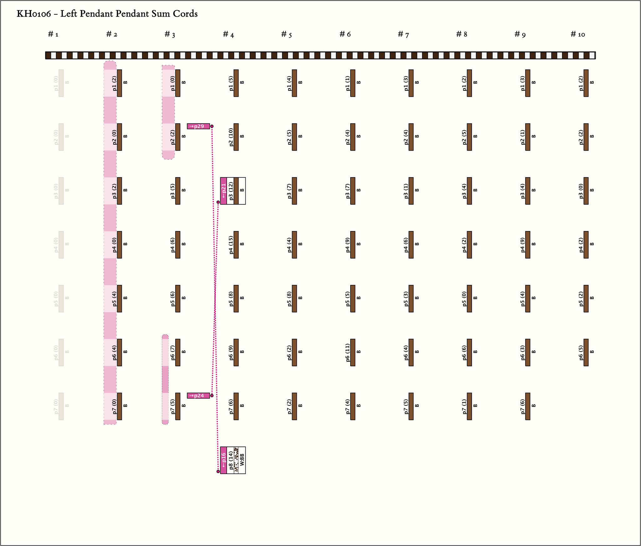 - Three pendant fragments are stored with the khipu. They were color B; lengths 29.0 cm., 28.0 cm., and 30.5 cm.; and values 1, 2, 0 respectively. One of them might be the remainder of this pendant.