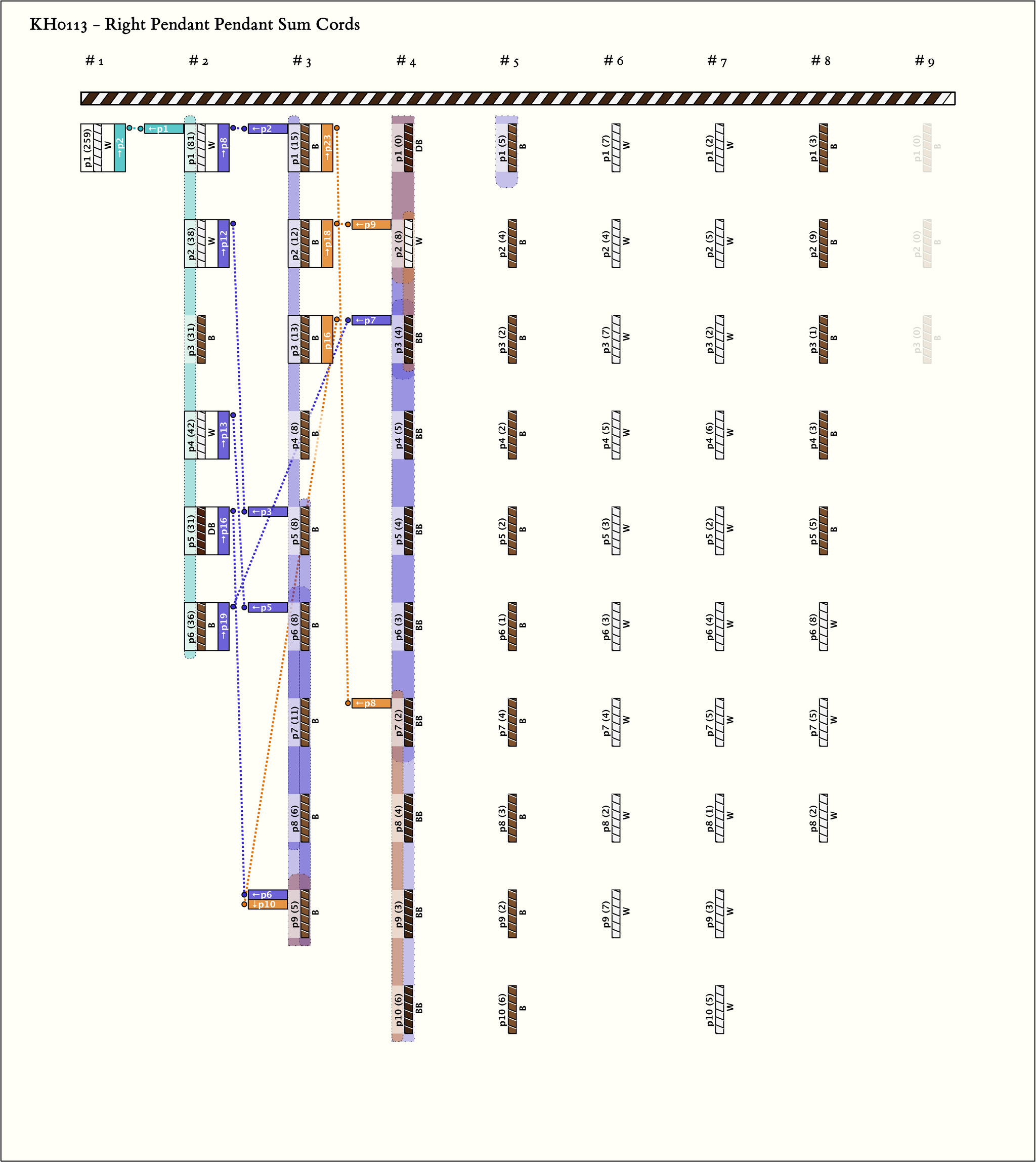 - By spacing, the khipu is separated into 3 parts. A single cord dangles from the end of the main cord, then part 1 is 1 group of 6 pendants, part 2 is 6 groups of 8-10 pendants each, and part 3 is 1 group of 3 pendants. Each pendant in part 1 has one subsidiary which is DB.