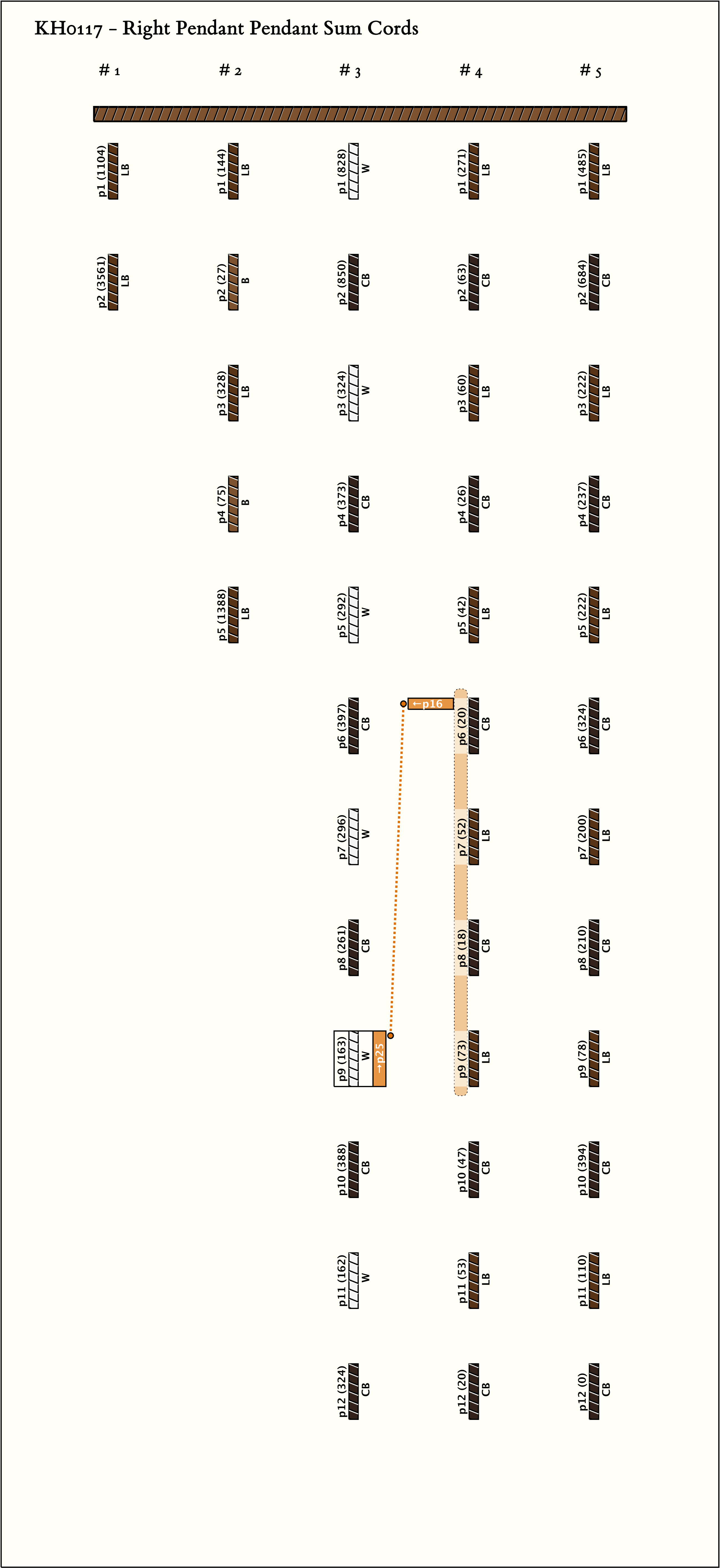 - Each group has an alternating color pattern: the pendants in group 1 alternate LB, B with all subsidiaries CB; group 2 pendants alternate W, CB; group 3 alternates LB (with a W subsidiary), CB (with a CB subsidiary); and group 4 alternates LB (with a B subsidiary), CB (with a CB subsidiary).