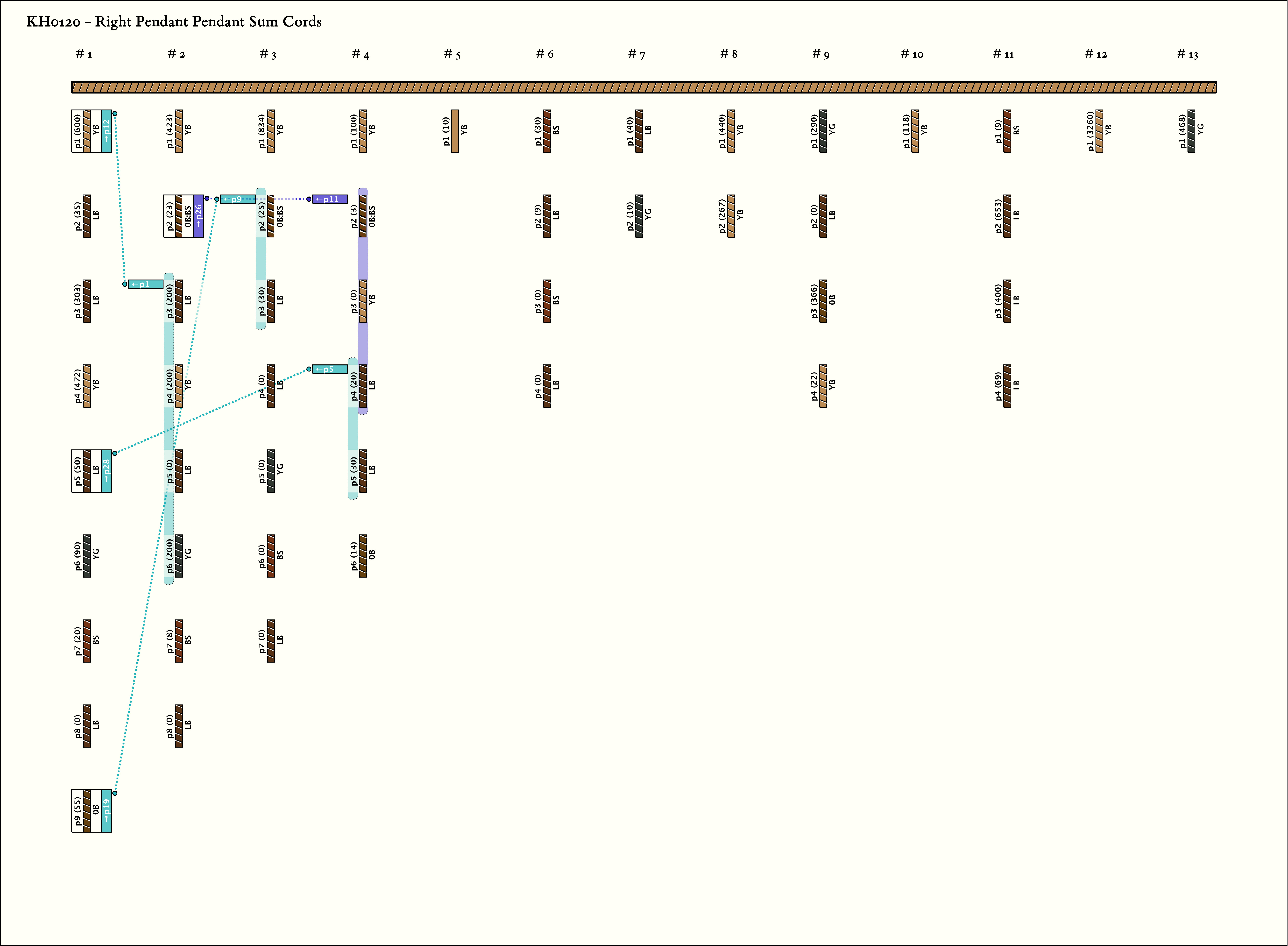 - KH00116 and KH00117 are designated by the same Museum number. KH00117 is loosely tied around the wooden bar through which KH00116 is threaded. The 4 cord colors used on KH00117 are 4 of the 5 colors used on KH00116.