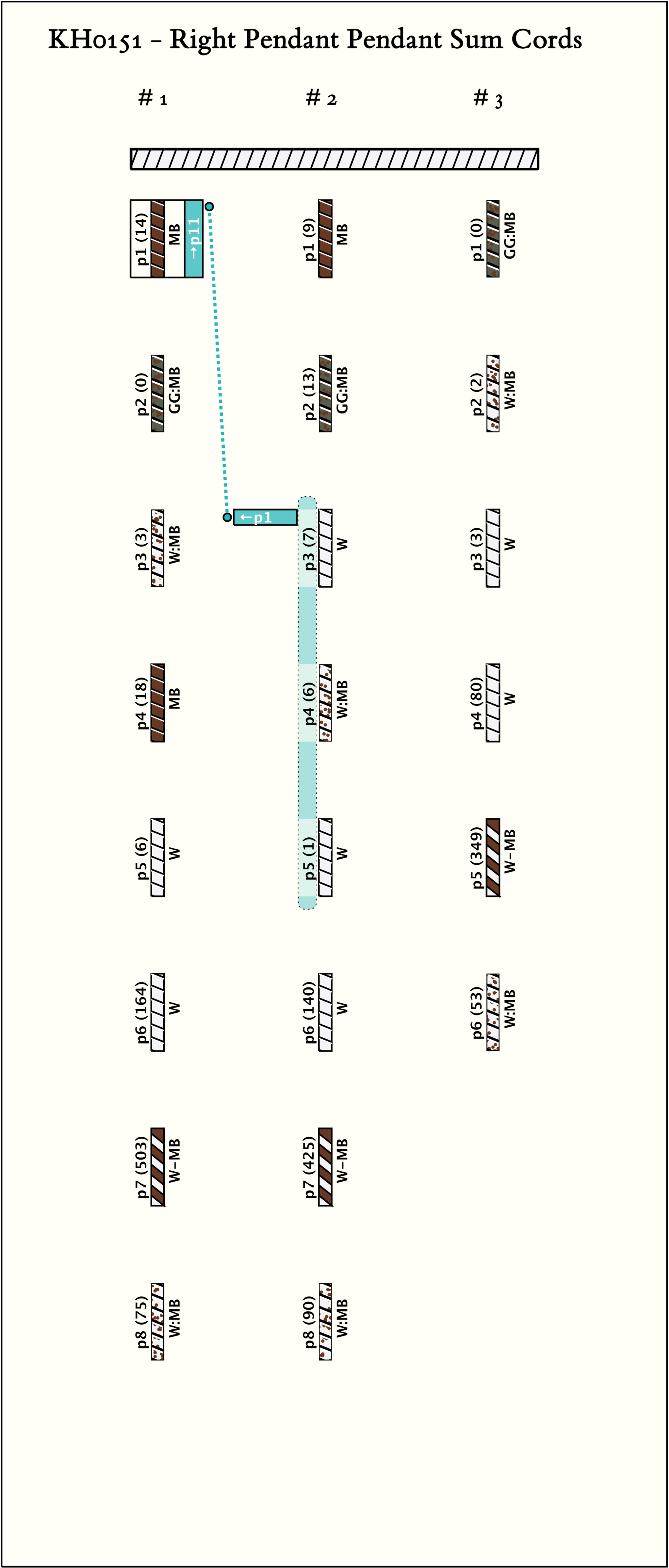 - By spacing, the khipu is separated into 3 groups. Each group has a similar color pattern: MB, MB: GG, 2 mixtures of MB and W, W, W, MB-W, MB:W. The mixtures of MB and W vary. They are MB:W/W/MB, MB/W, W/MB, and MB:W/MB. (Note. that on the khipu, the 2 colors W and MB have been used alone or in combination in 8 different ways.) Where there are only 6 pendants in a group, it is the first and third positions that are non-existent.