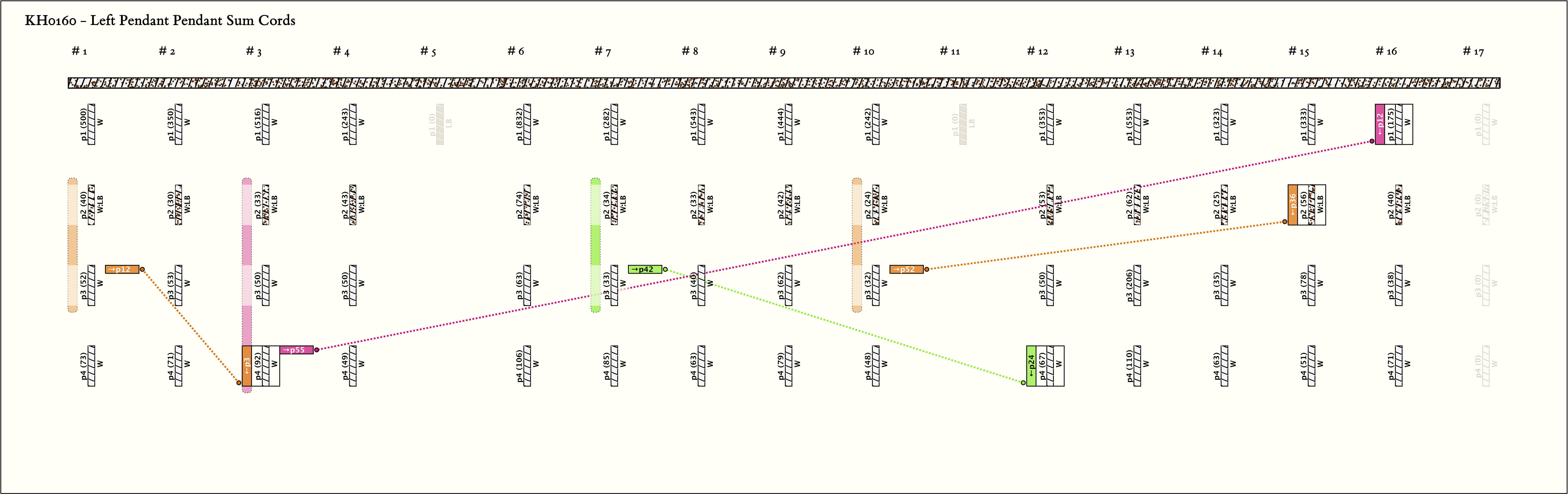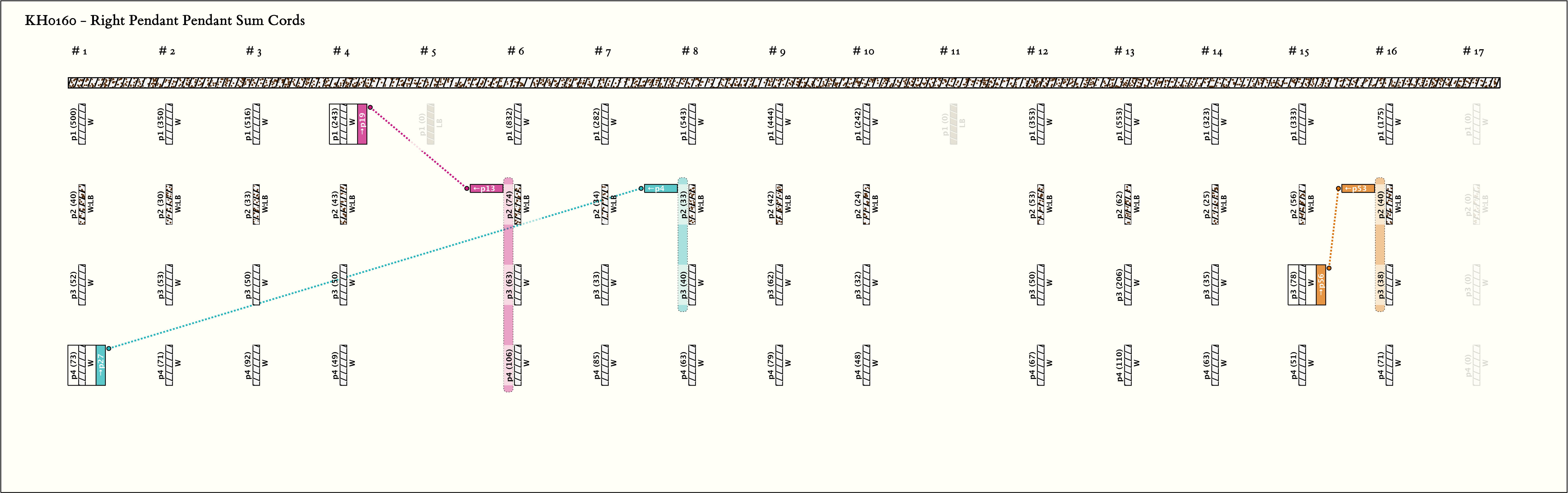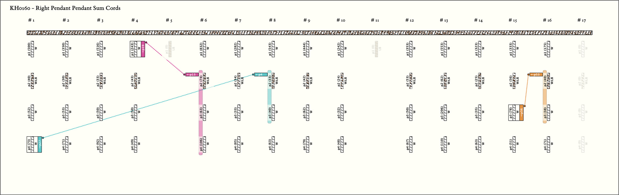 - By spacing and markers, the khipu is separated into 4 parts. The first part is 4 groups, the second and third parts are 5 groups each, and the last part is 1 group. All groups have 4 pendants with the same color pattern: W, LB:W, W, W.