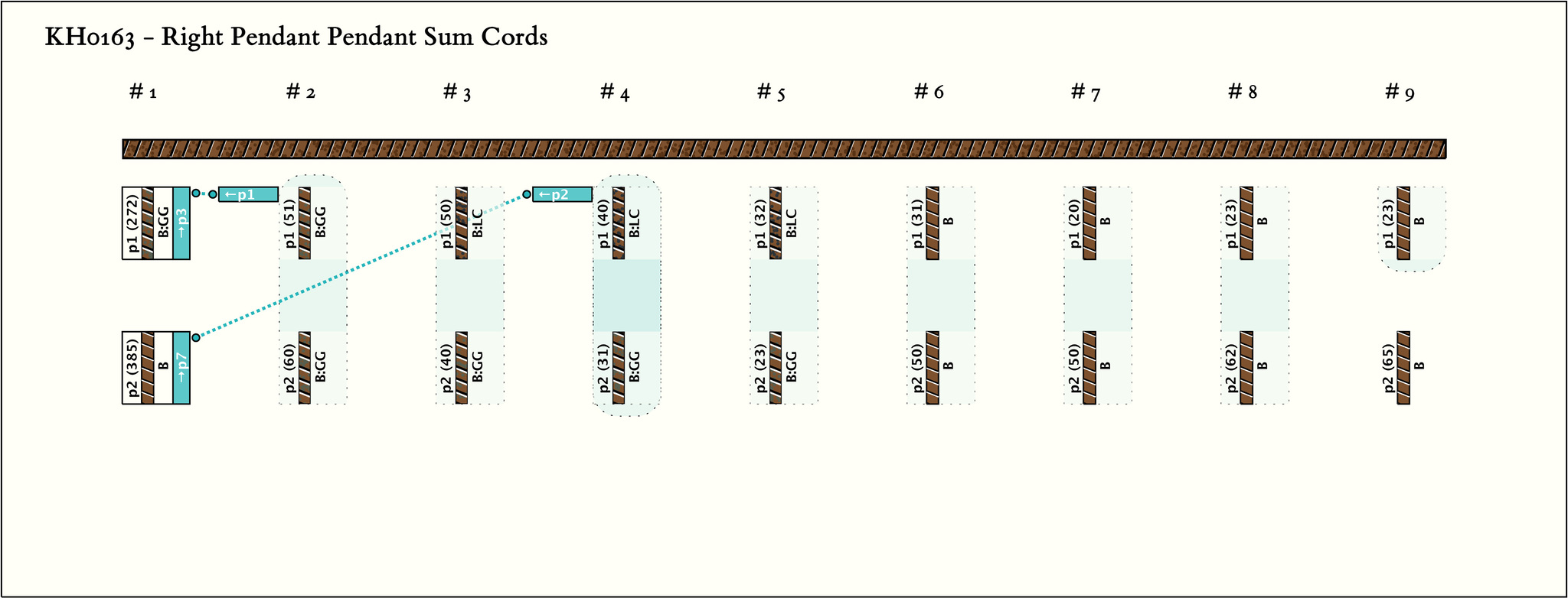 - The 3 khipus are similar in grouping. In all of them, the first part sums the following parts. KH0163 and KH0164 are both separated into 3 parts with the second and third parts each containing 4 pairs of pendants. In KH0163, the pair in part 1 sums the 8 pairs in parts 2 and 3 position by position. In KH0164, there are 2 pairs in part 1 so the sums are separate for each part and each position in a pair. KH0165 is also in 3 parts but it differs in the number of groups per part and the number of pendants per group. Again, the values in part 1 are sums, bô€–»t only of values in part 2, which in turn contains sums of values in part 3.