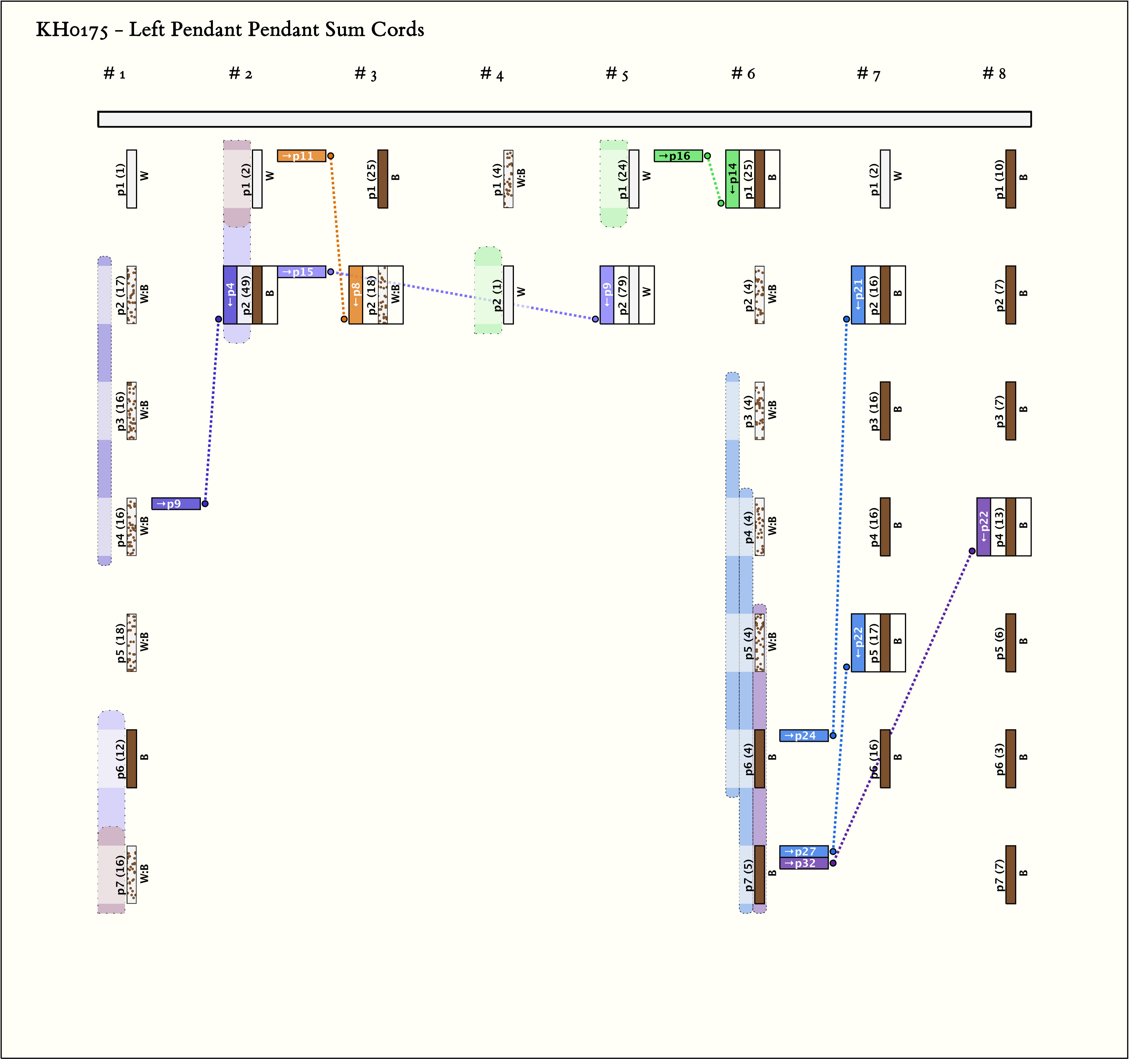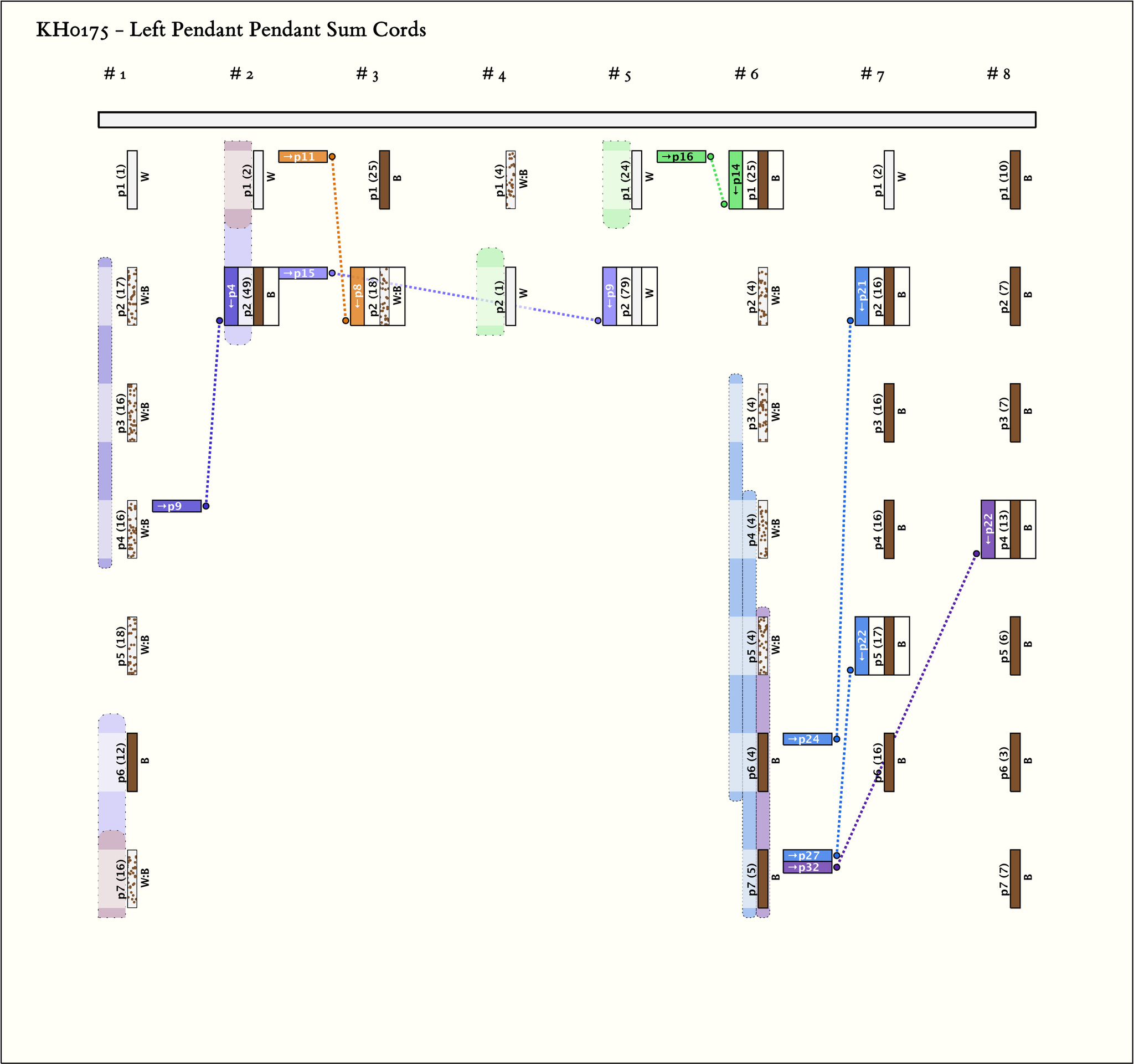 - By spacing, there are 8 groups with different numbers of pendants. There are much larger spaces on the main cord between groups 6-7 and 7-8 than there are between others. The only consistent colors are in the 3 groups with 7 pendants each (groups 1, 6, and 8). Group 8 is unified: all pendants are B. Groups 1 and 6 both have the pattern X, 4B:W, 2X where X=W in group 1 and X=B in group 6.
