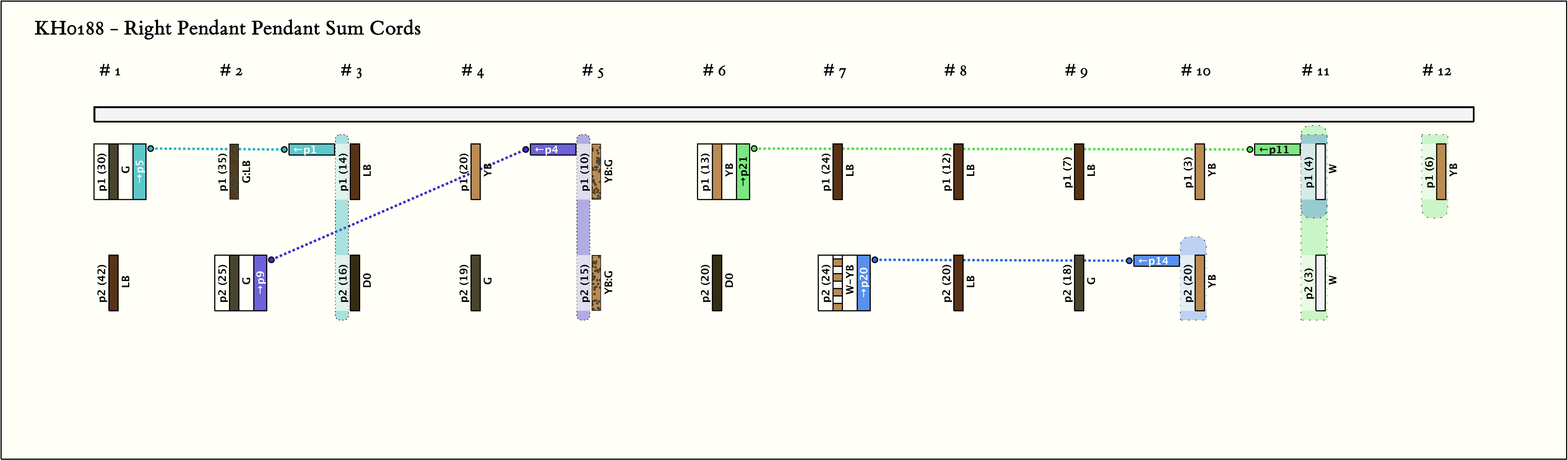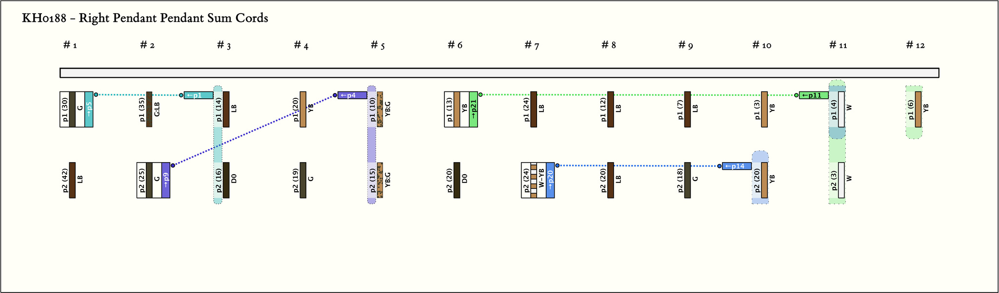 - By spacing, the khipu is separated into 11 groups of 2 pendants each and then 1 single pendant. In only 4 of the groups are both pendants the same color. All values are between 3 and 42.