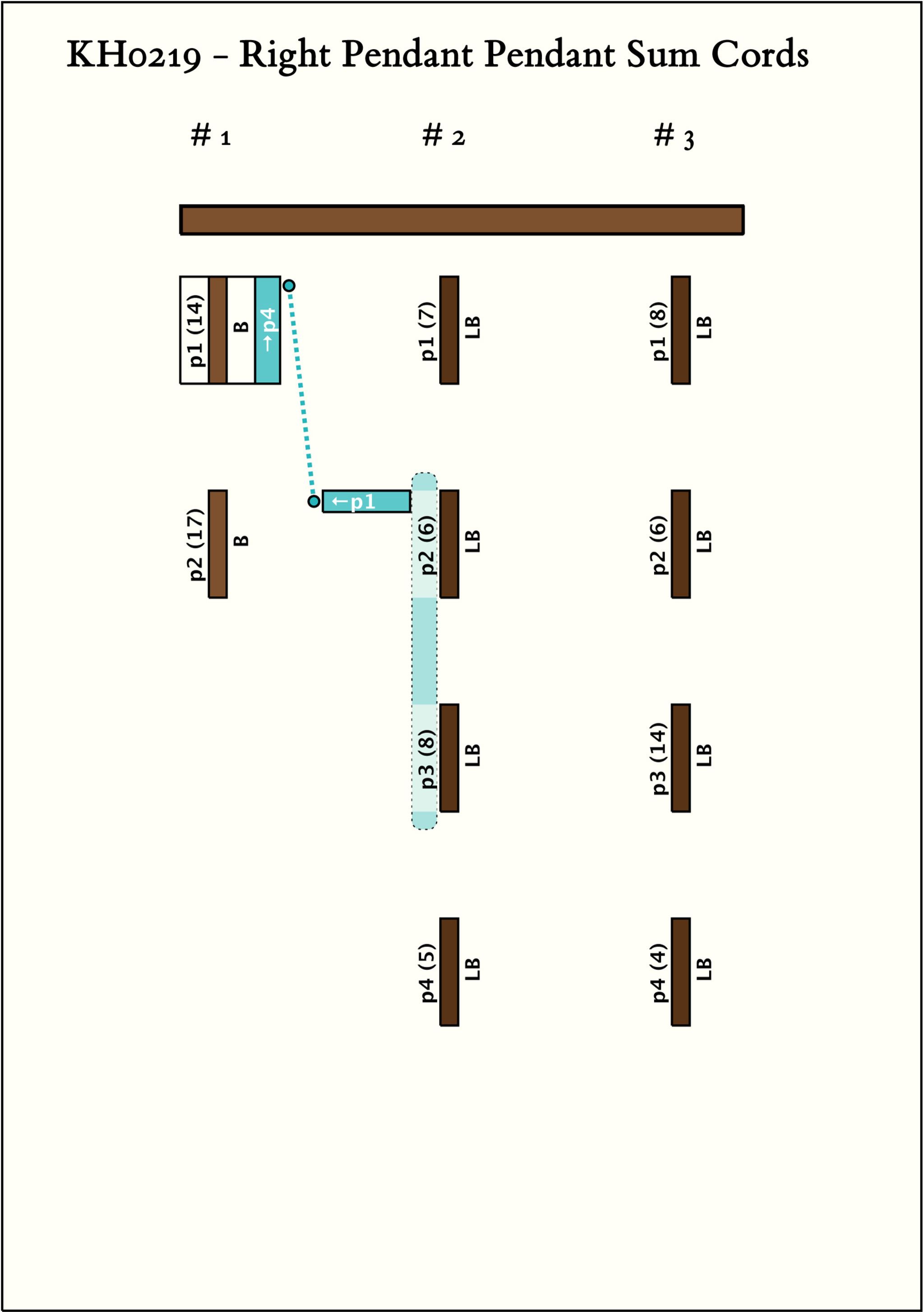 - By spacing, the khipu is separated into three groups of 2, 4, 4 pendants. Both pendants in the first group are color B. Each pendant in the next two groups is color LB with one subsidiary. The subsidiaries in the first of these two groups are LB, EB, or LB and EB mottled; in the second of these two groups they are all color B.