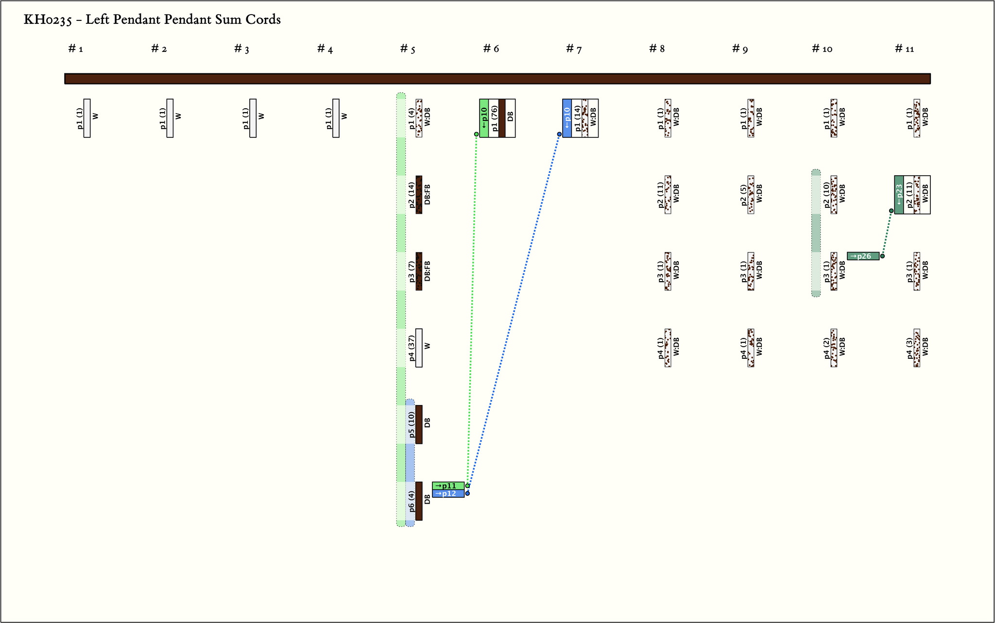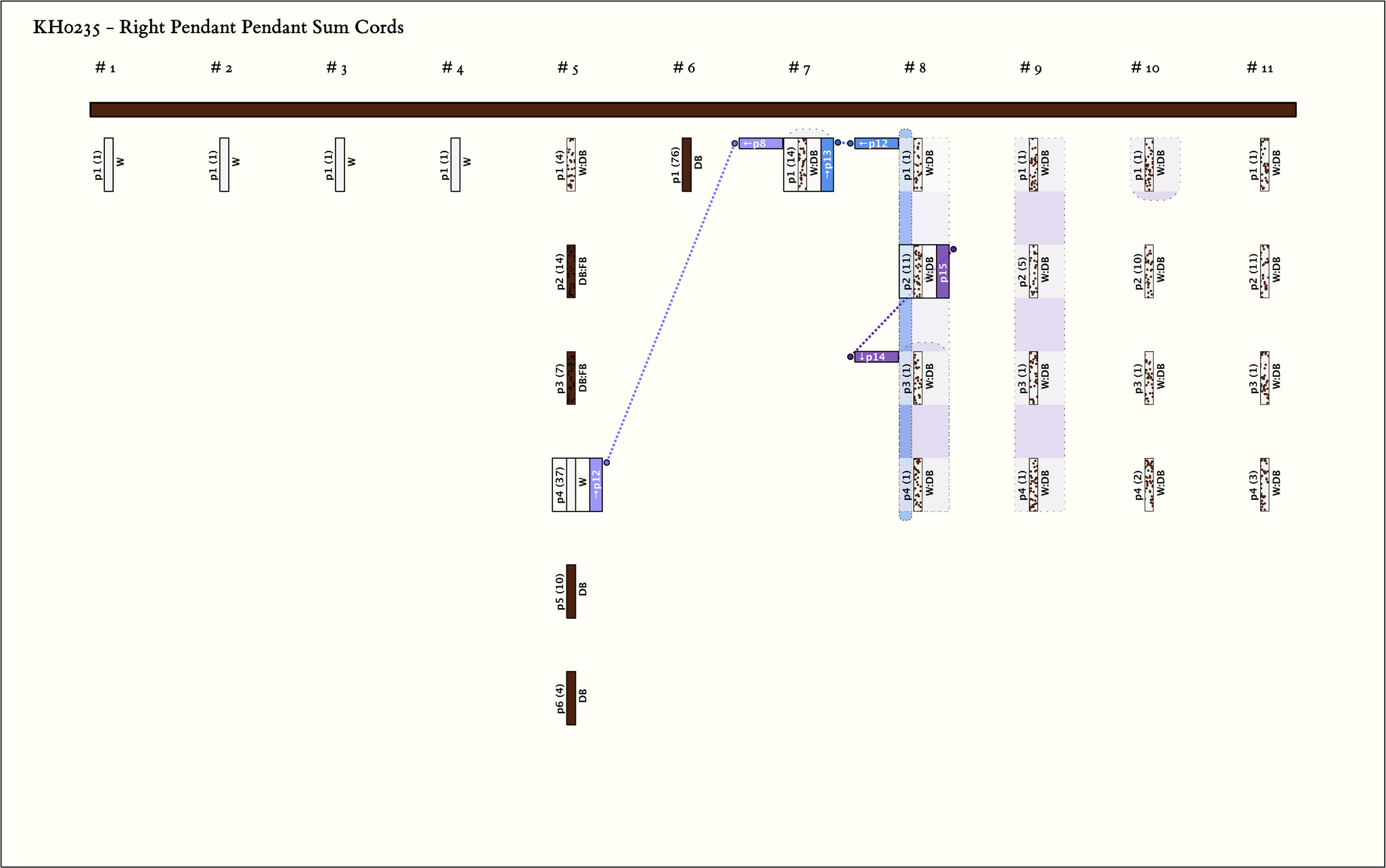 - The subsidiaries on the top cord probably sum the subsidiaries on the pendant cords but three values are in doubt due to breakage. The two W subsidiaries on the second pendant sum to at least 10 and another on the fourth pendant has value 2. A DB subsidiary on the third pendant has value 3 and an FB subsidiary on the fourth pendant is broken. These can be associated respectively with the following top cord subsidiaries: a W with value 13, a U with value 2, and a DB with value 4.