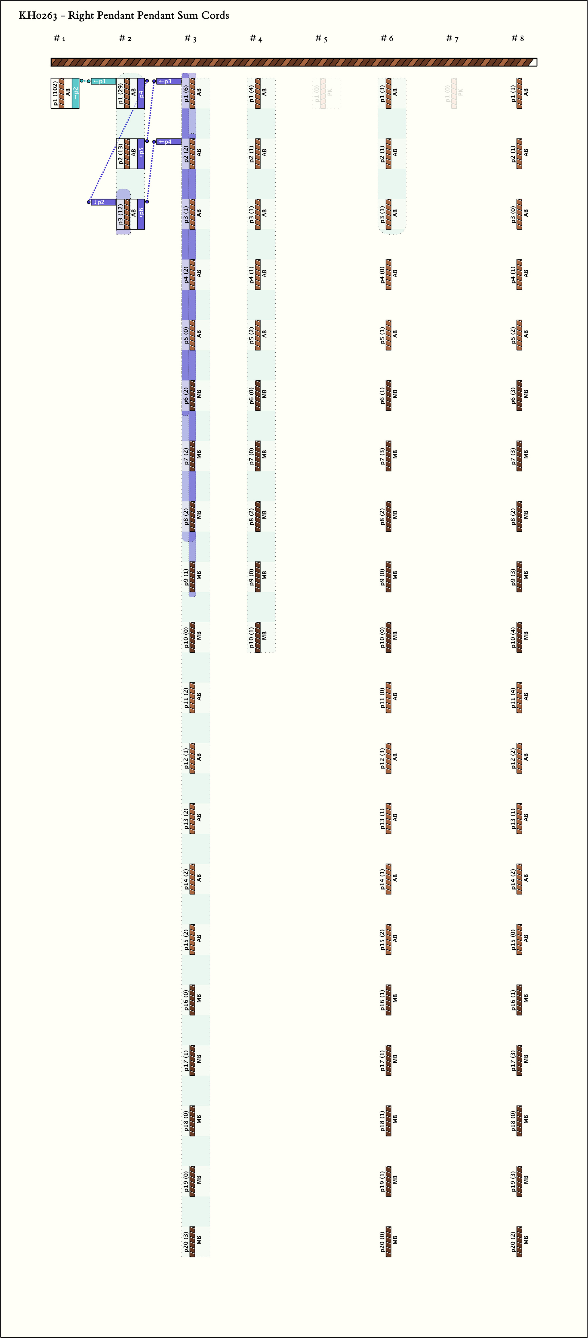 Cord p1 is the sum of p2-p4 including subsidiaries. Cord p5-p74 are grouped into various five-cord sets. Cluster 3,6, and 8 have 20 cords - 4 color-banded sets of 5 cords, alternating between MB (Moderate-Brown) and AB (Light-Brown). Cluster 4 is similar, with 2 alternate colored, color-banded, sets of 5 cords.