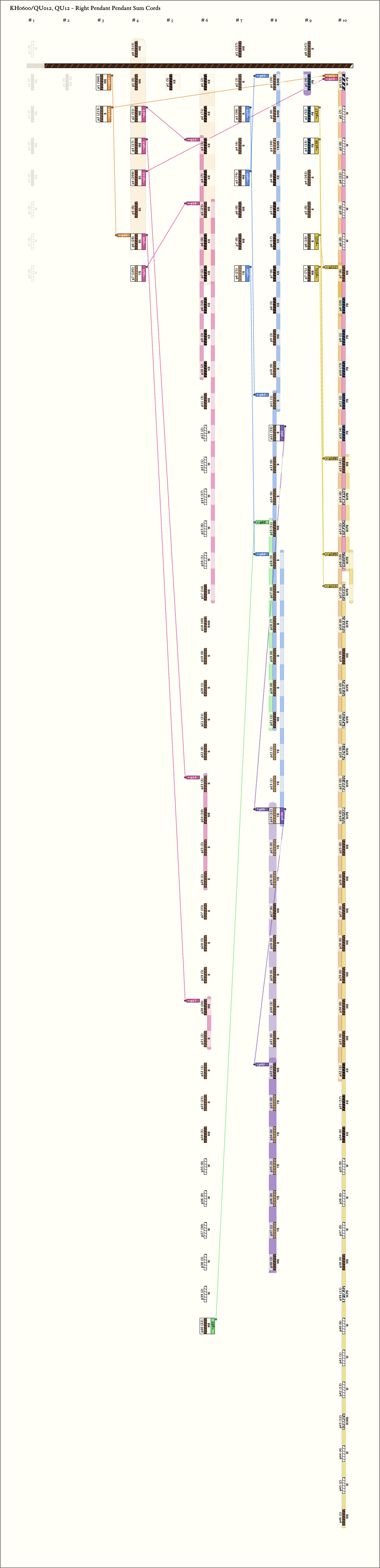 Very long main subsidiary -- probably used as a wraparound cord, but also holds the blank pendants and is tied awkwardly to the main cord.
