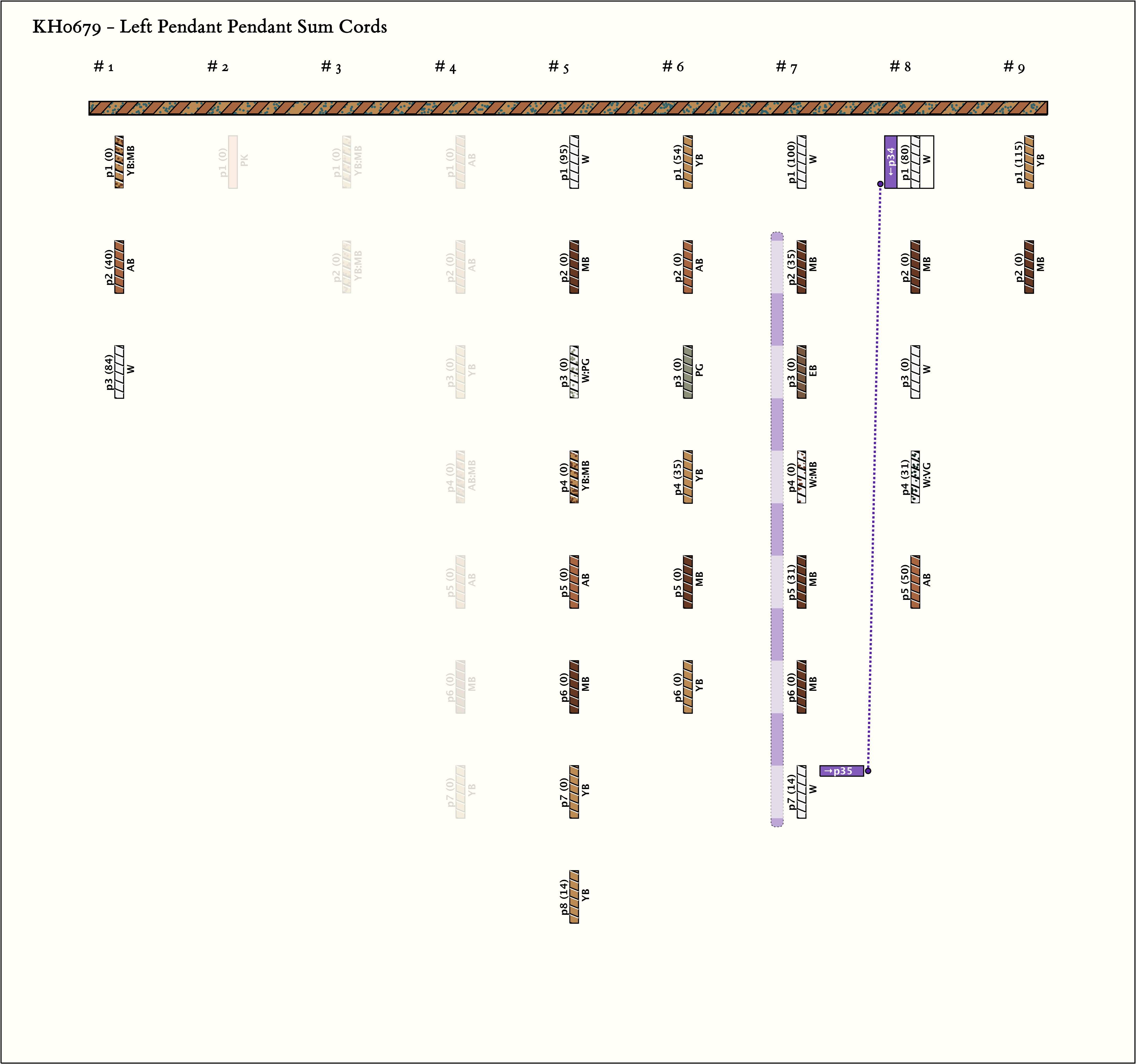 Museum Description: Object forms part of Detmold's sizable collection of Inka/Andean artifacts, which includes textiles, ceramics, the "Detmold Child" and metal works. One of four khipus in the museum collections (three of which are on display). Displayed flat in the exhibit, in same configuration over the past several decades (lying ~flat, slight angle for viewing in waist-high glass display case in the "Kulturen der Welt" exhibit on the third (top) floor of the museum). Mounted on a cloth board with KH0681 (which is not from the Gaffron collection). The khipu has a thick primary cord, which wraps around an MB, Z-spin/S-ply component of the primary cord which is exposed on the right hand side of the cord. Many detached/broken cords are placed by museum conservators on the mounting for aesthetic affect. These detached components (often with long knots) are not recorded in the data table, but are photographed. There is a high incidence of broken cords on the khipu, which often makes identification of attachment knot direction challenging. Many of the pendant cords (denoted in Notes) appear to have attachment knots tied on top of the primary cord, potentially signaling top cords. It is unlikely that the string have all been "inverted," as many pendant cords appear attached traditionally, toward the base of the primary cord.