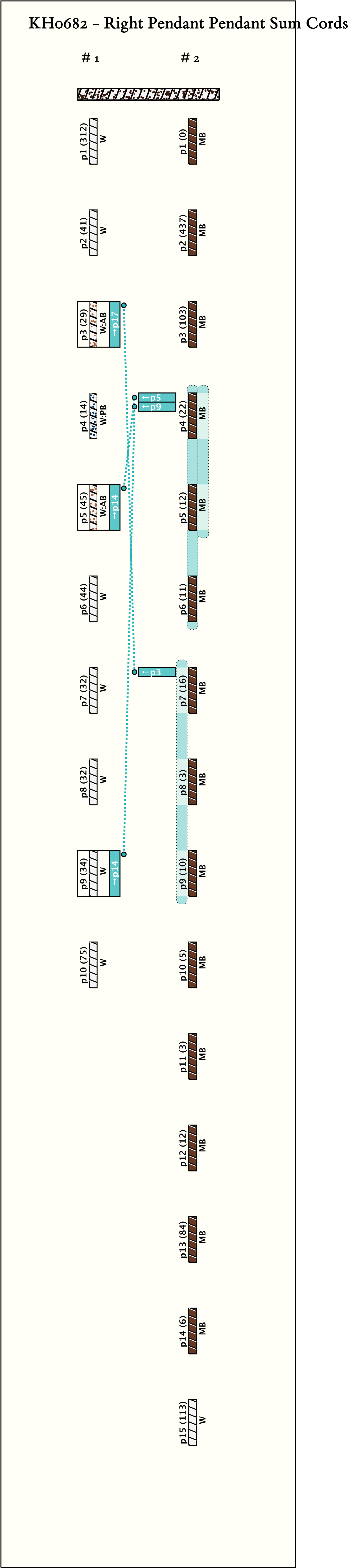 This khipu is one of 10 sewn onto a black fabric backing. There is no evidence to indicate that the 10 khipus were originally part of the same artifact, and they are thus recorded separately. The tarp itself is inventoried under IVc.366.03; I append the letters A-J to signify which khipu is referenced in the data, since many individual detached cords are sewn on as well, but are not considered khipus (for the purposes of this catalog) since they lack their original primary cord. The tarp corresponds to drawings attributed to Erland Nordenskiöld, an early Swedish archaeologist and anthropologist who was a head curator of the Ethnographic Museum in Gothenburg.
