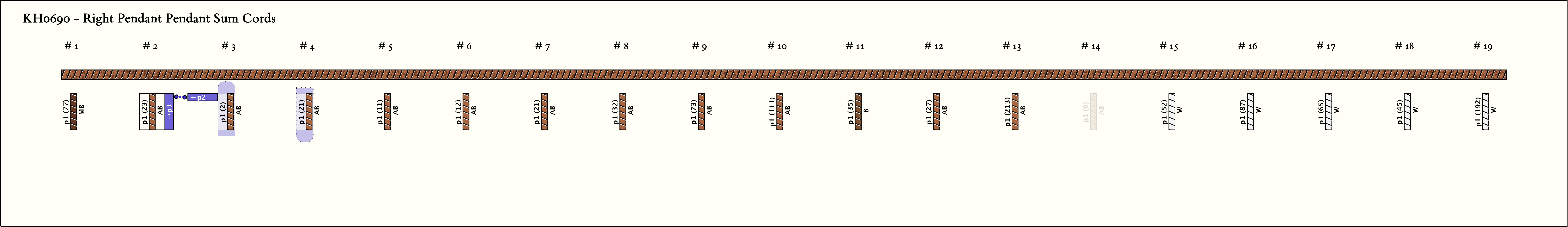 Moderate size khipu fragment with a tenuous and fragile primary cord. Given the looseness of the attachments, there is some question as to whether the cords are all original to this khipu. It is clear that the first "pendant" (as viewed from the left as mounted; a cord with a substantial subsidiary bundle) was tied on later with thread near the beginning of the fragment, although this detached pendant is not original to the fragment it is associated with. This spurious pendant is omitted from the data table.