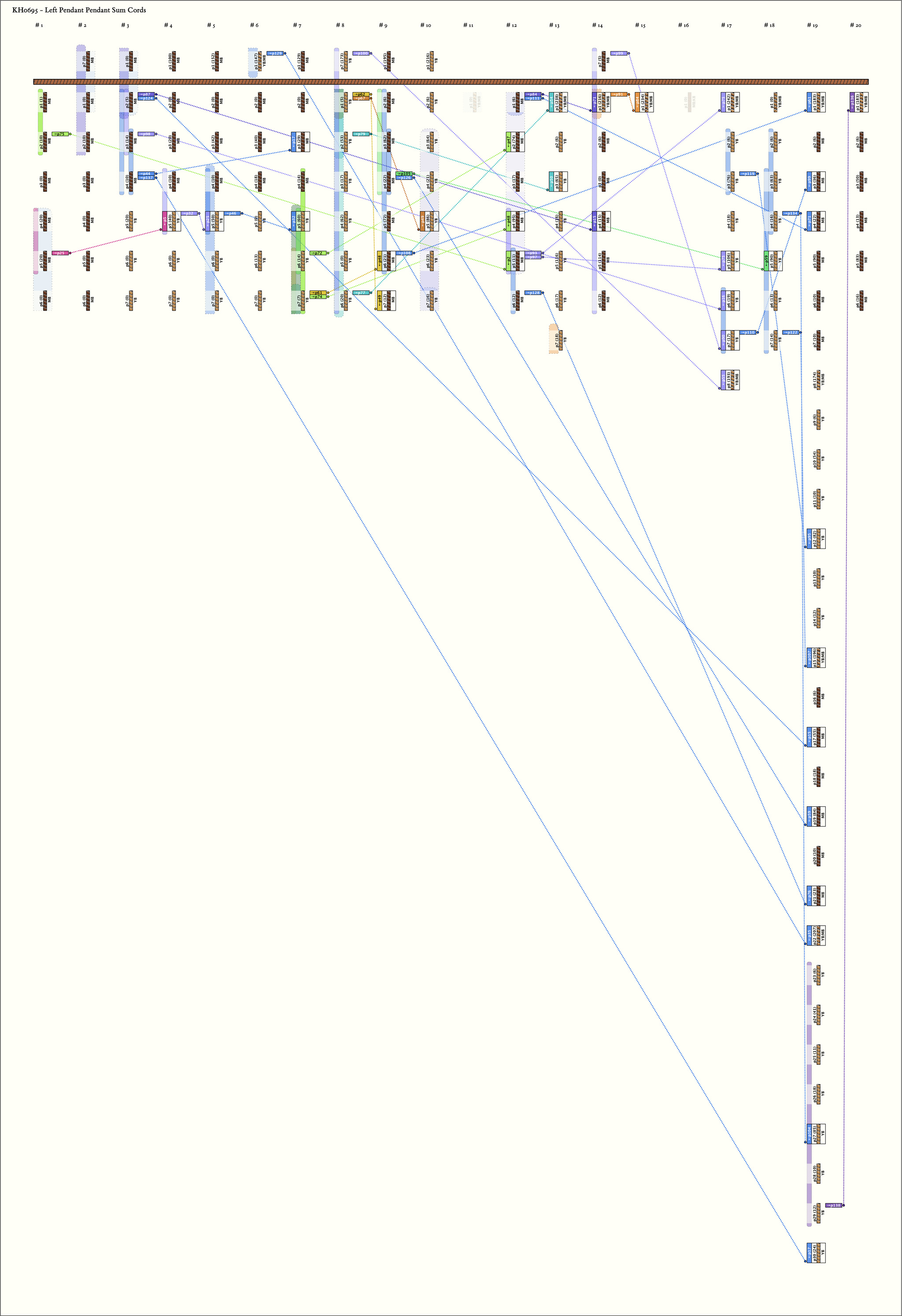 Notes: ***Read from left to right as mounted. Note that this khipu consists of two primary cords tied together. Primary cord 1 has one string attached to it and was recorded separately. This is the record for primary cord 2.