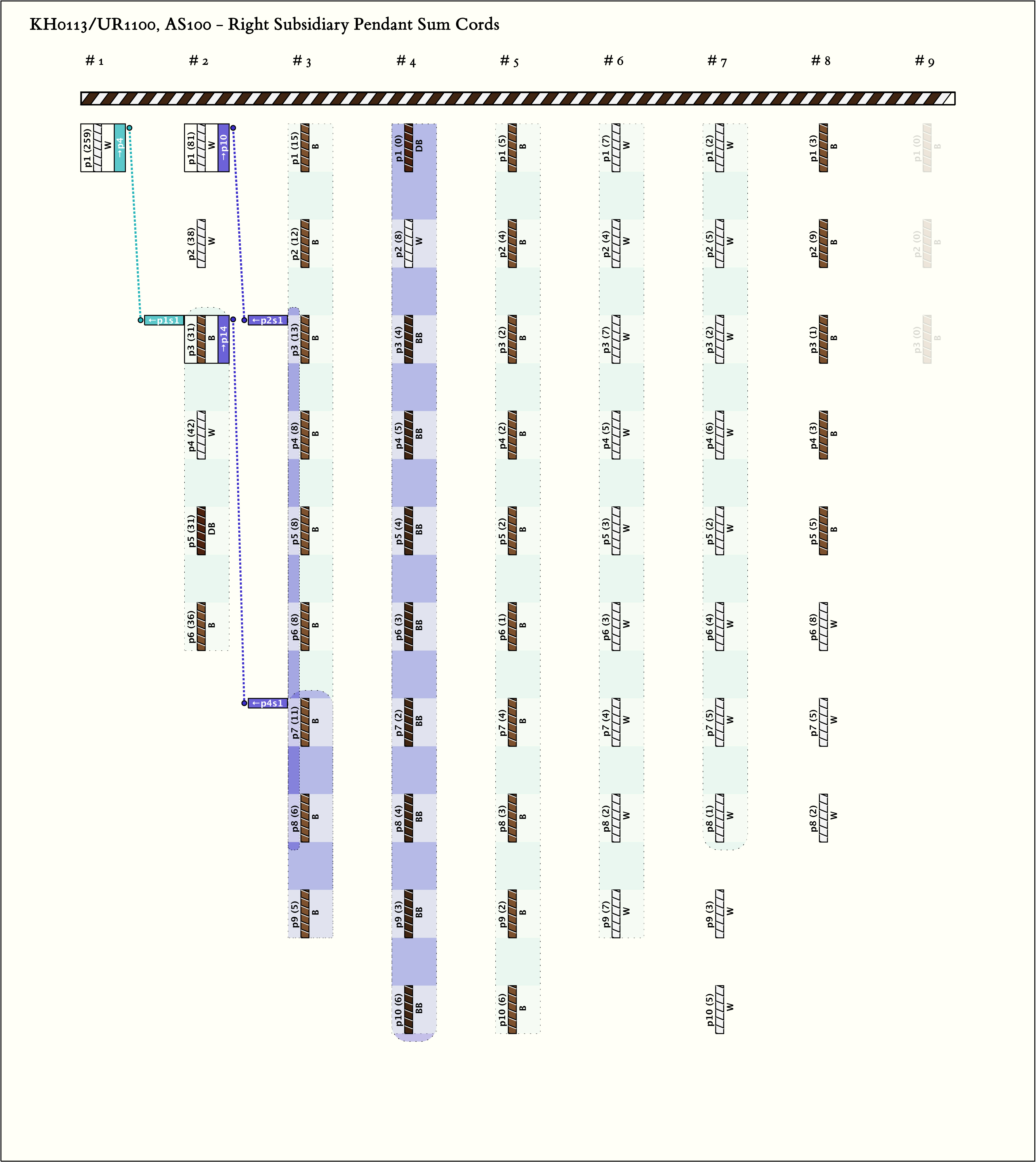 - By spacing, the khipu is separated into 3 parts. A single cord dangles from the end of the main cord, then part 1 is 1 group of 6 pendants, part 2 is 6 groups of 8-10 pendants each, and part 3 is 1 group of 3 pendants. Each pendant in part 1 has one subsidiary which is DB.