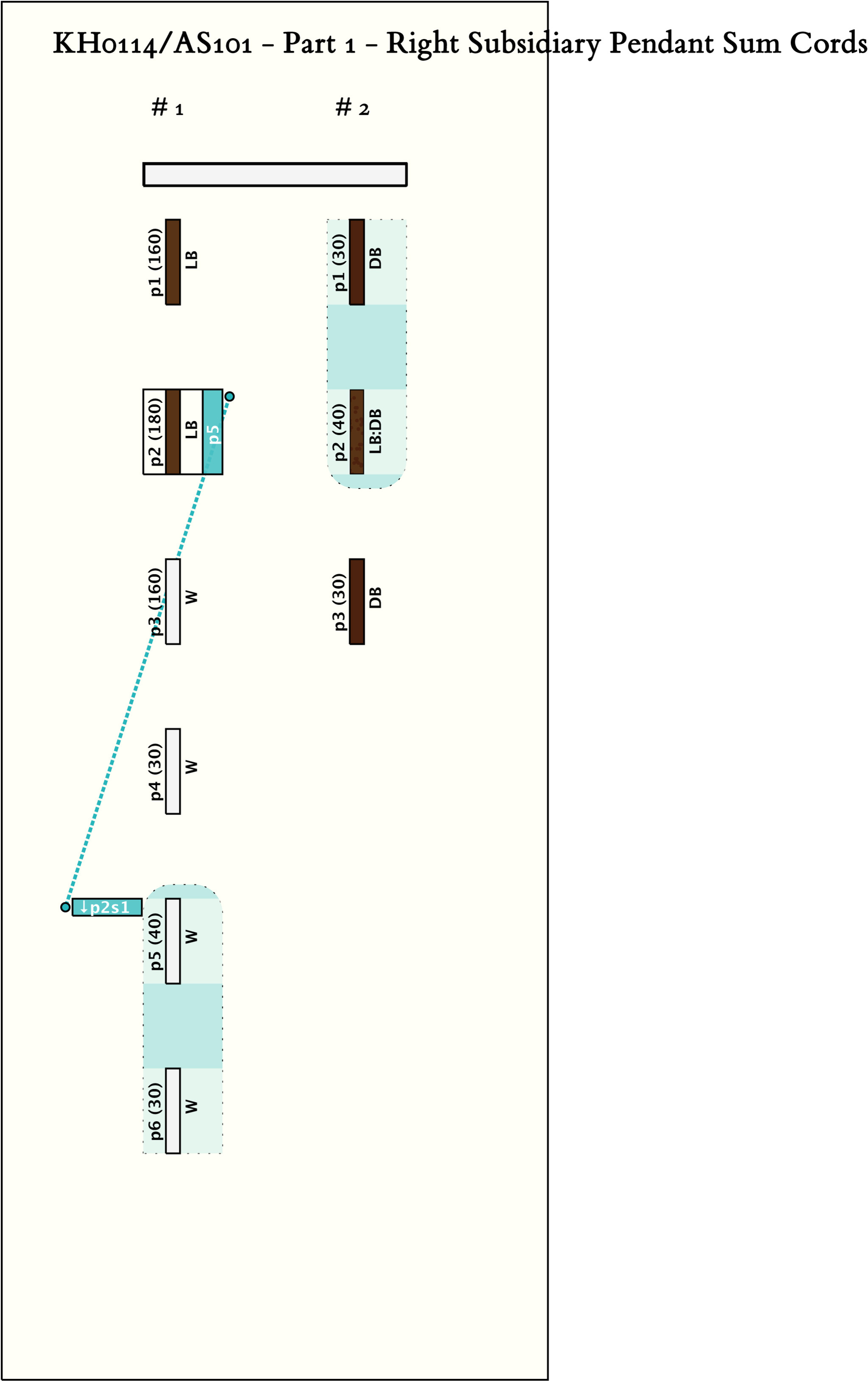 - Construction note: KH00111 consists of 2 khipus tied together. The 2 parts are listed separately as AS 101 Part_1 and AS 101 Part_2. A discussion of them is in KH00111 Part II.