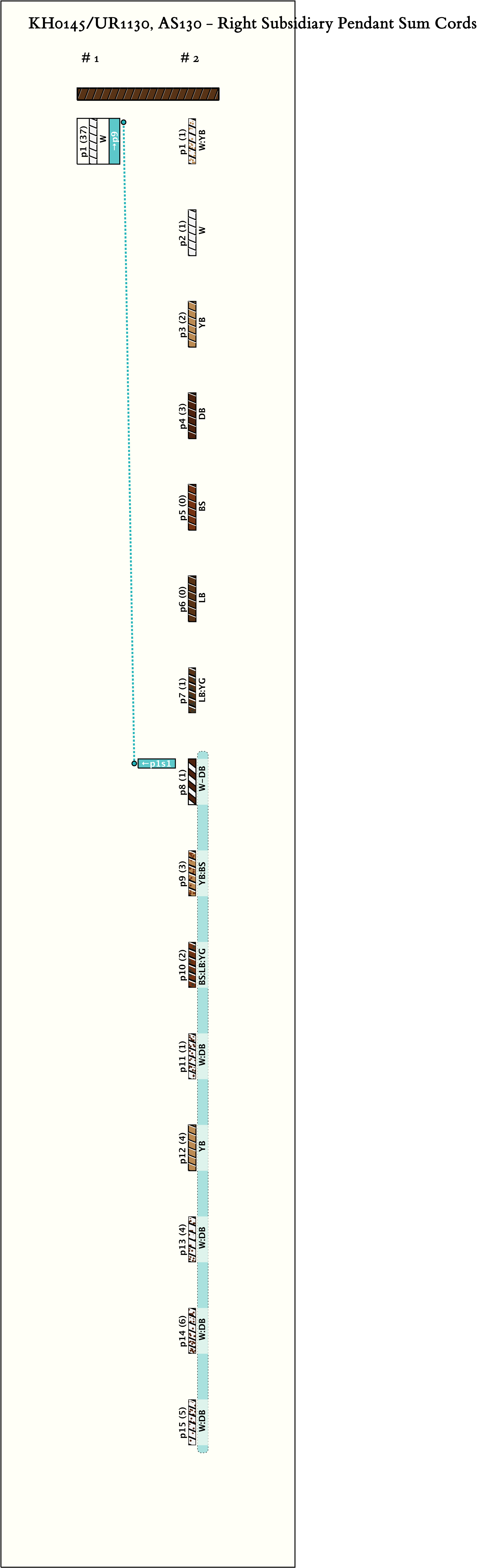 The main cord is LB. The first group of pendants begins 49.0 cm. from the twisted end. Then there are 21 pendant groups. Each of the first 14 groups takes up about 1.5 cm. along the main cord with about 0.5 cm. between groups. Each of the last 7 groups takes up about 1.5 cm. along the main cord with about 1.5 cm. between groups. After another 5.0 cm. of main cord, it terminates in a fringed woven ball. (There are 5 ribs each approximately. 3 cm. wide and separated from the next rib by 0.5 cm. Thus, the ball measures about 4.0 cm. around and is 1.25 cm. at its widest.)